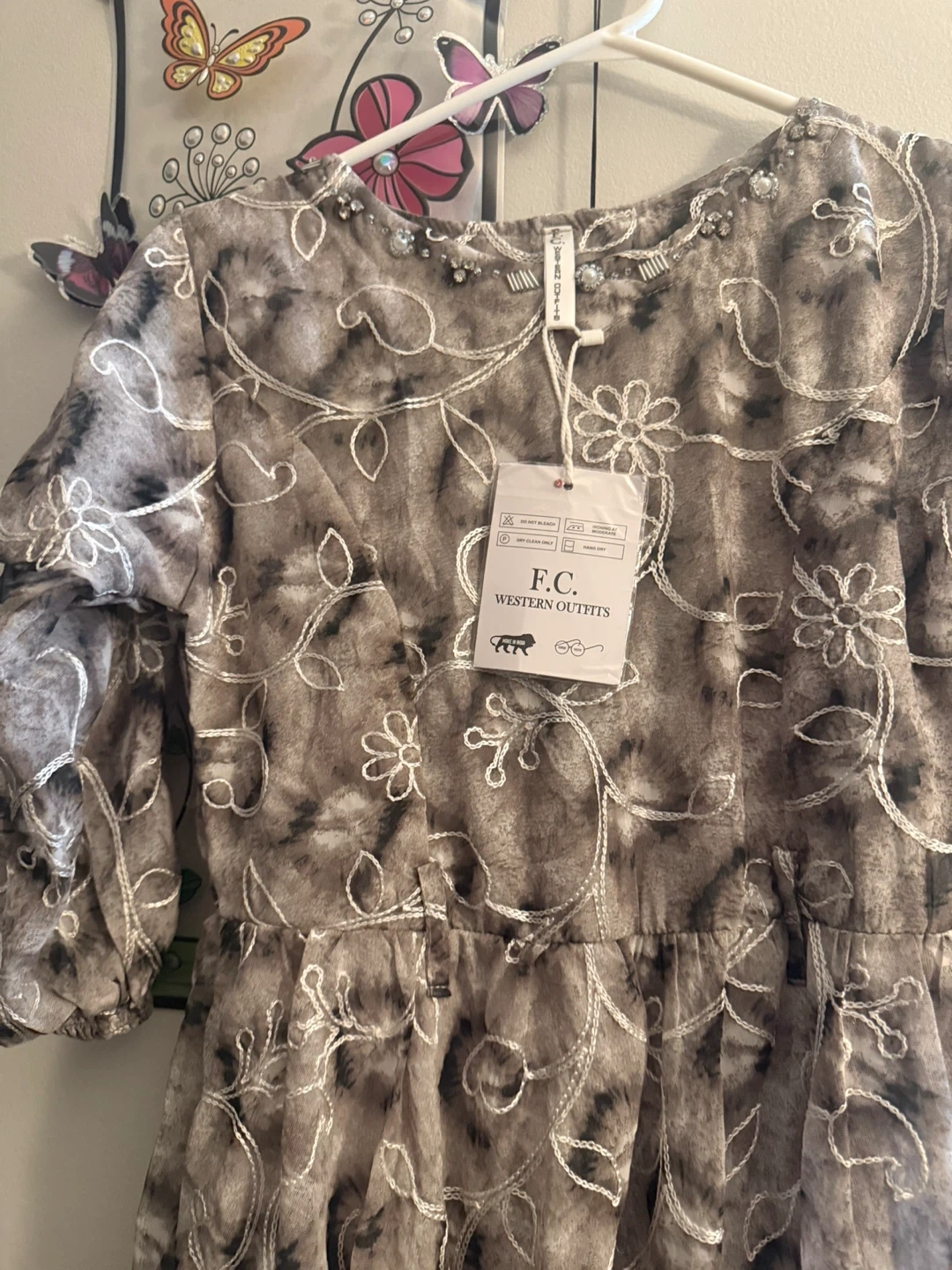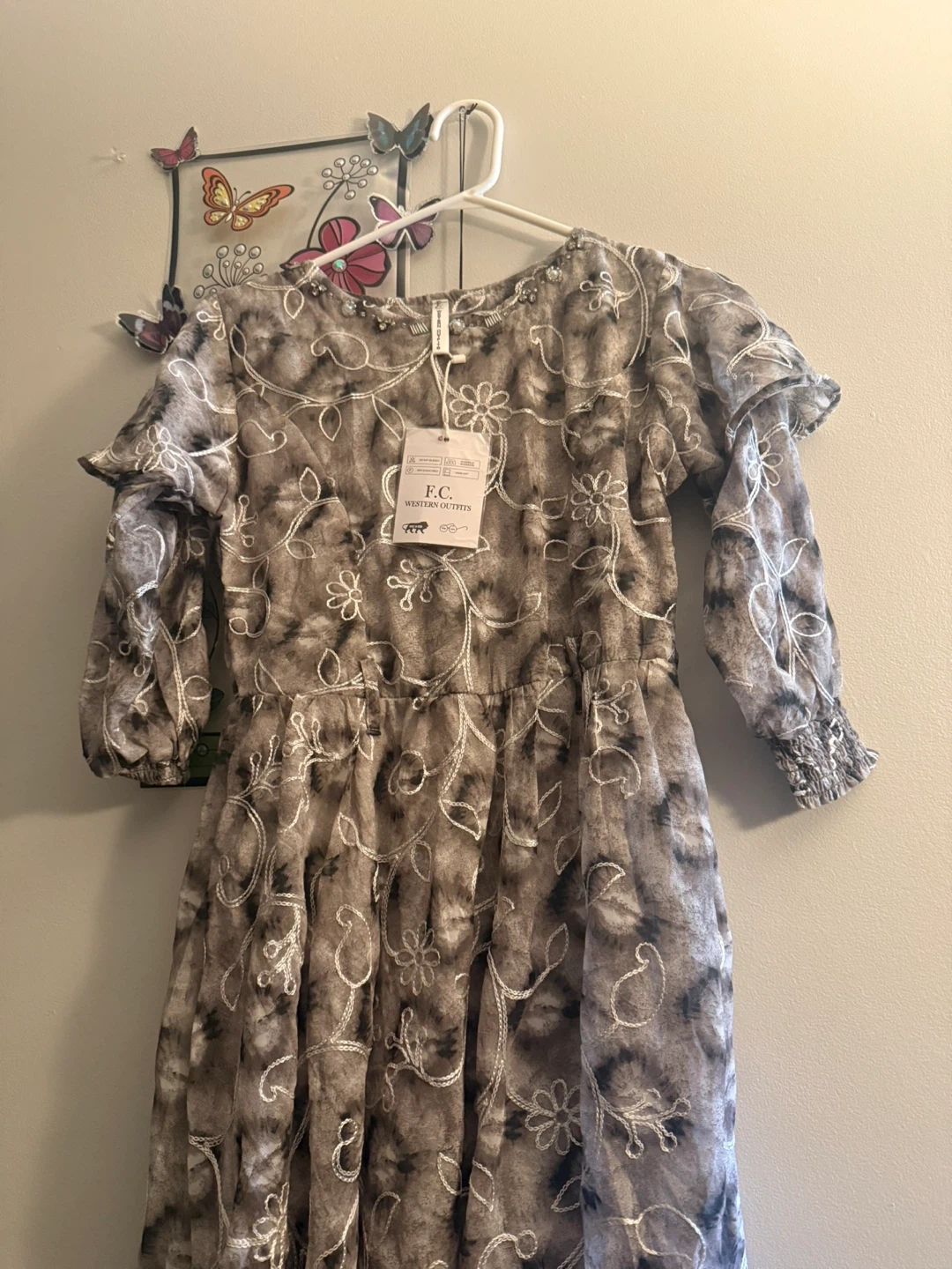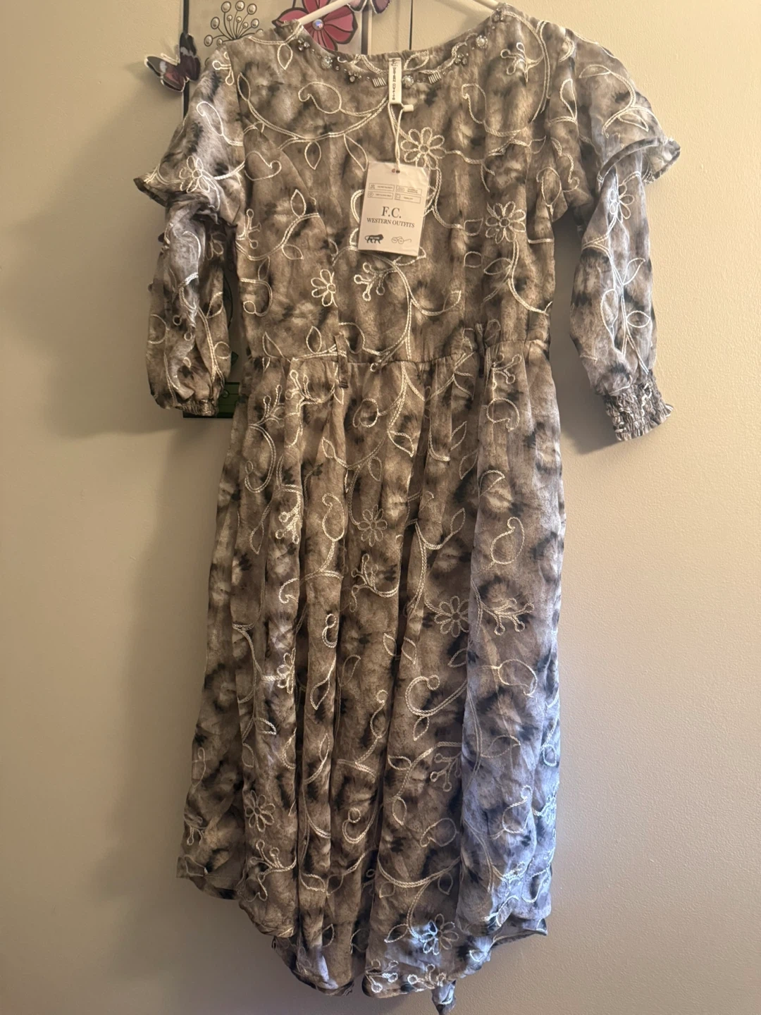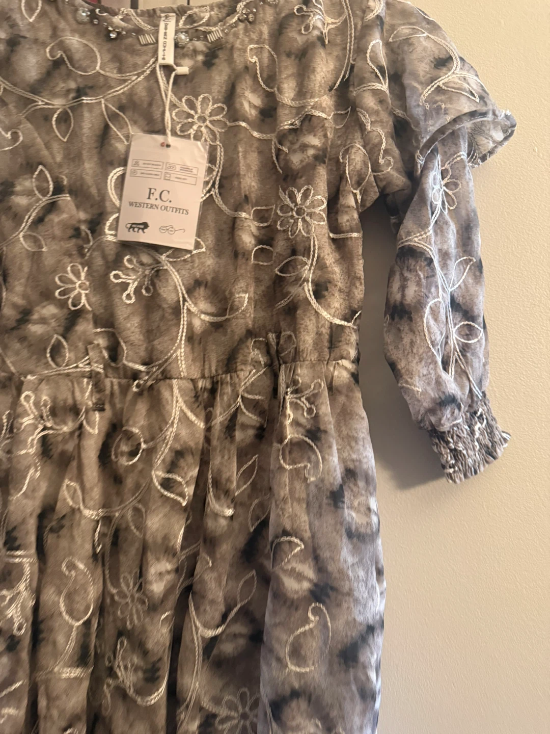 This is a brand new dress from F.C. Western Outfitters. It has a unique pattern and design. Perfect for a special occasion or a stylish everyday look. It's in excellent condition with tags still attached