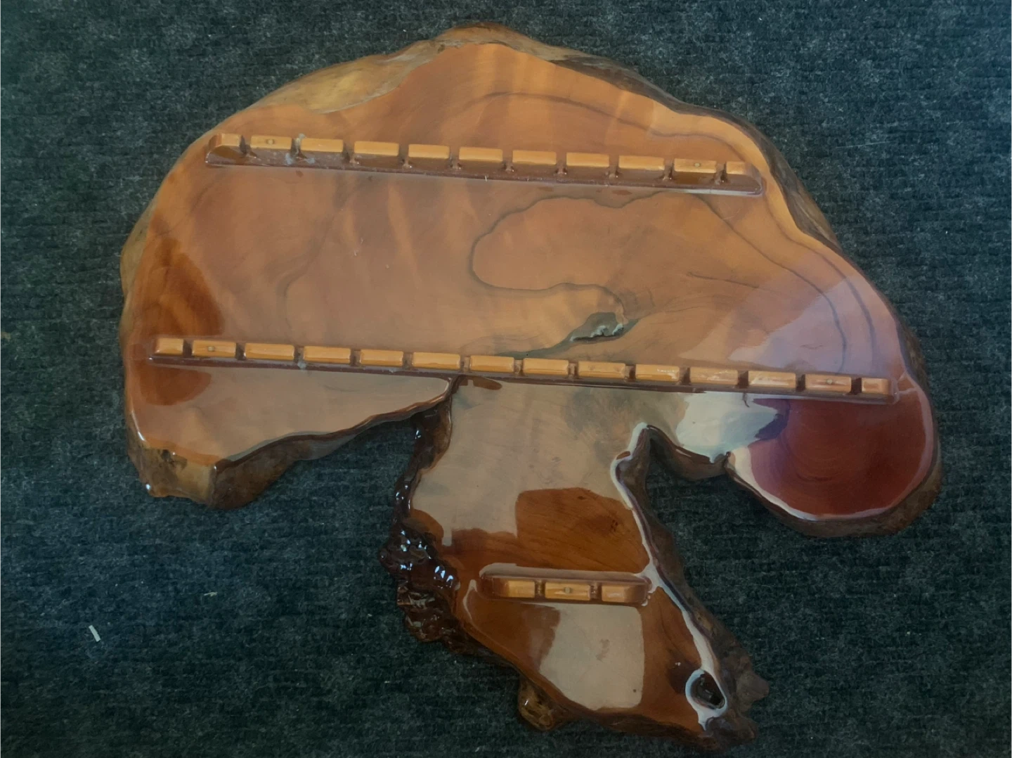 Selling a unique handmade wooden spoon display. It's got a beautiful natural wood grain and a glossy finish. Perfect for showing off your favourite spoons!