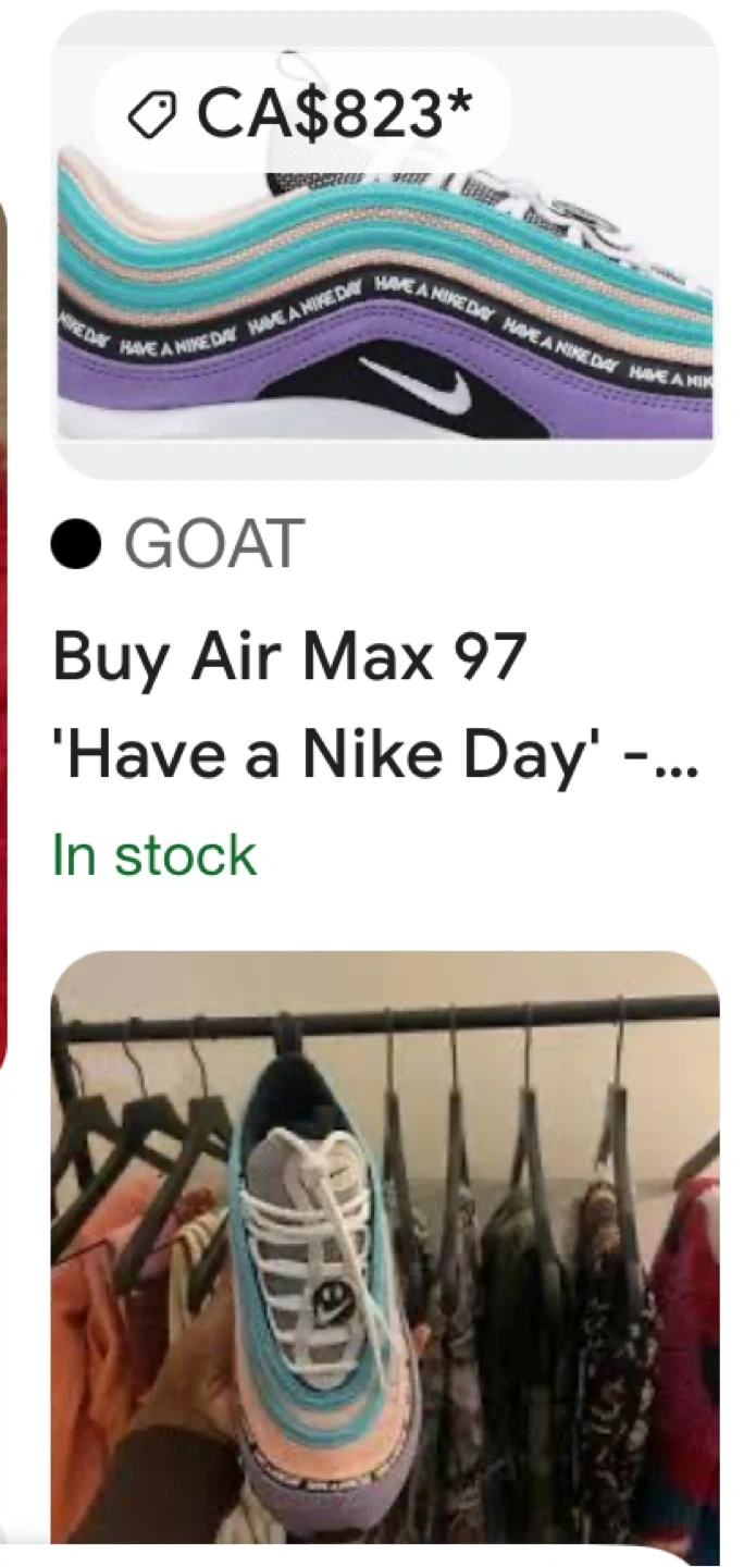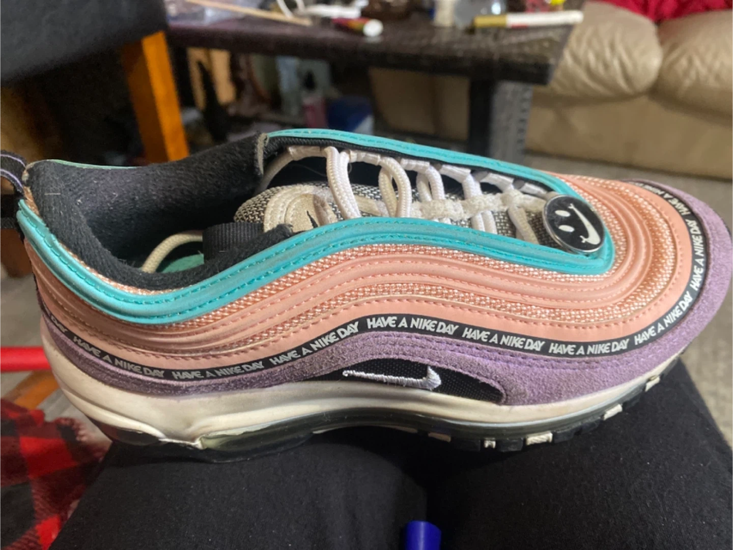 These Nike Air Max 97 'Have A Nike Day' sneakers are in great condition! They feature a unique colourway with pastel shades and the 'Have A Nike Day' slogan around the shoe. A fun smiley face detail adds a playful touch. Perfect for adding a pop of colour to your wardrobe! Size 4.5 Retail price is 850$. They are brand new never worn once