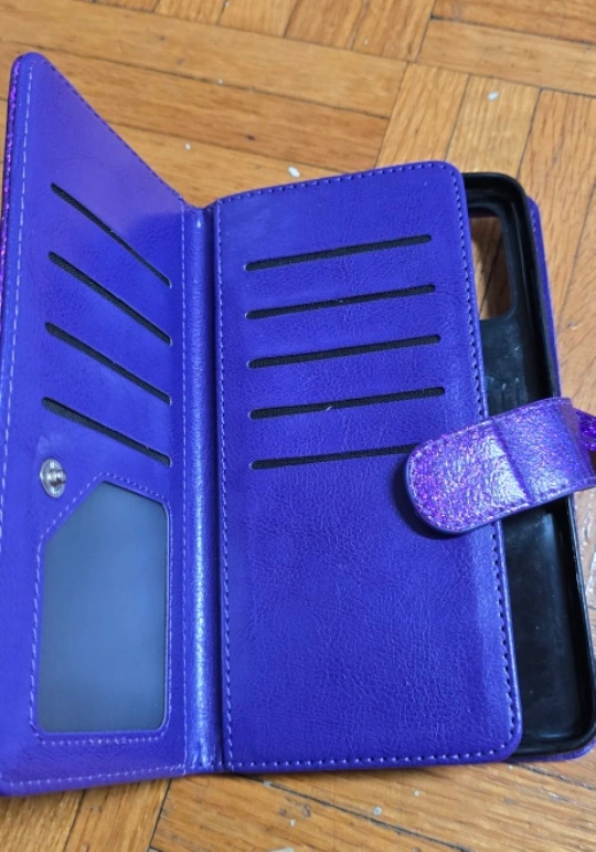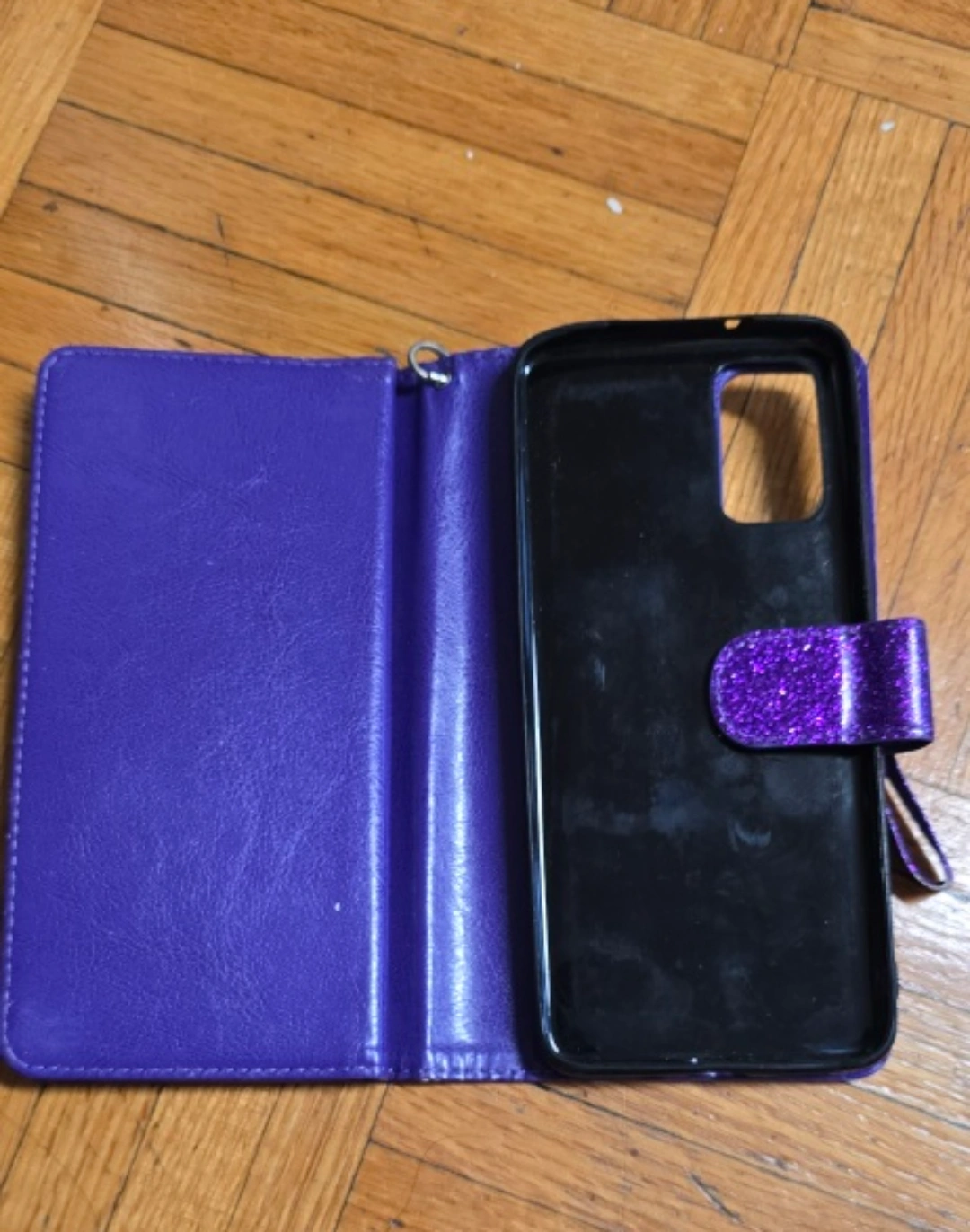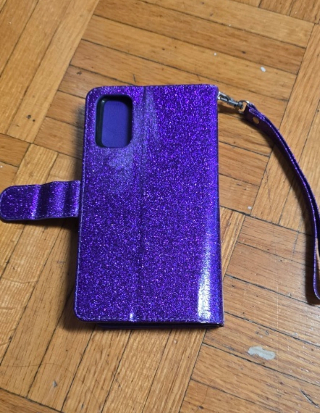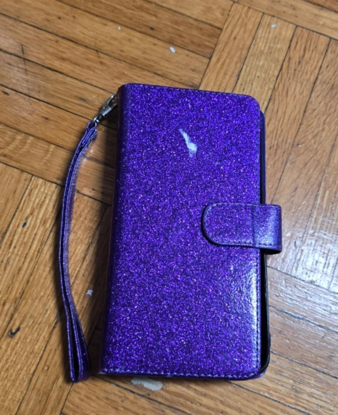 60This is a sparkly purple phone case with a glittery finish. It has a wrist strap and slots for cards inside. It's in good condition and ready for a new home!