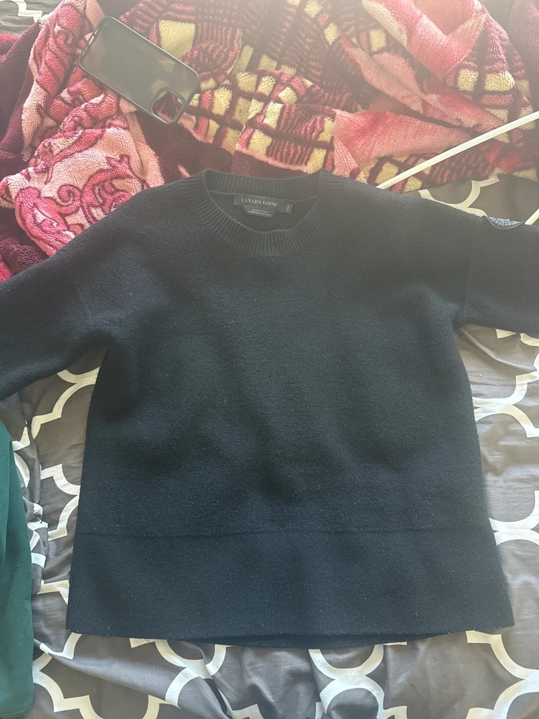 Selling a Canada Goose black sweater in size medium. It's in great condition and made in Italy. The material feels really nice and warm, perfect for the Canadian weather!