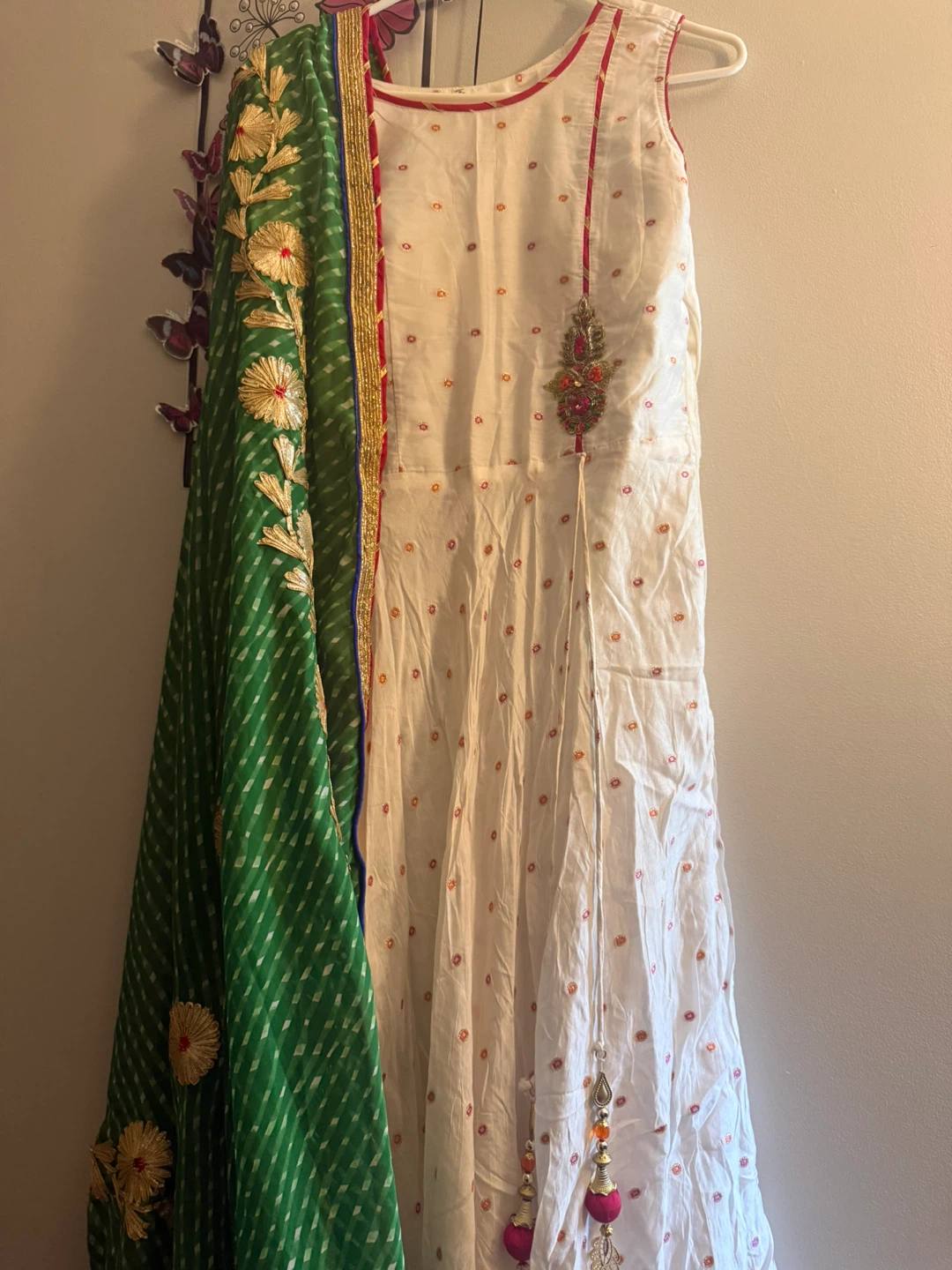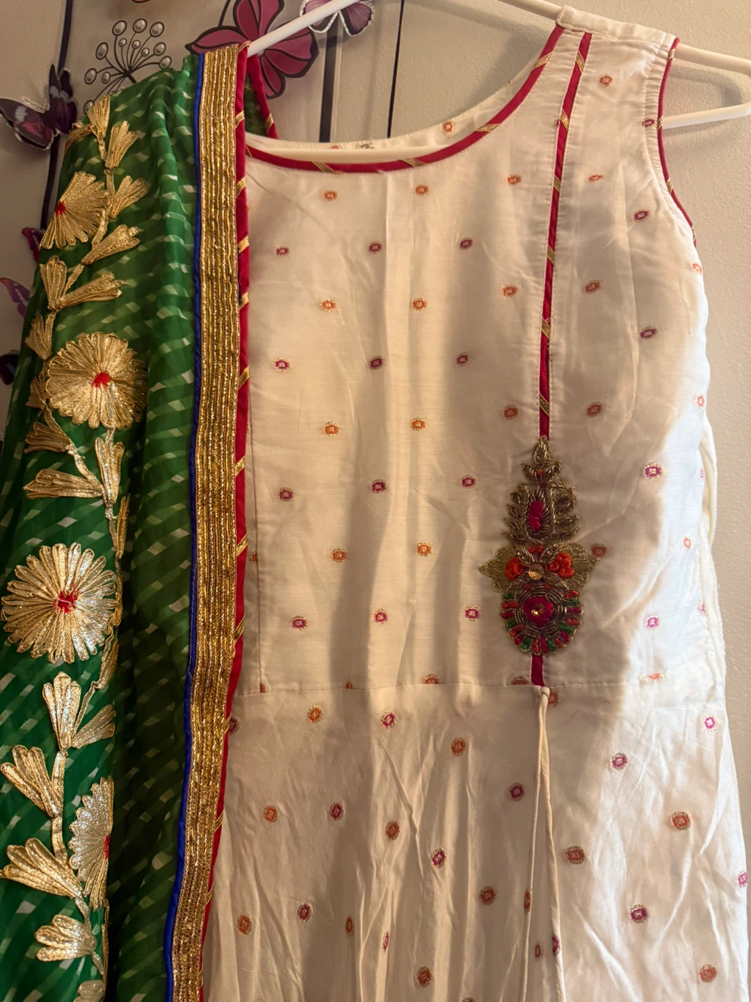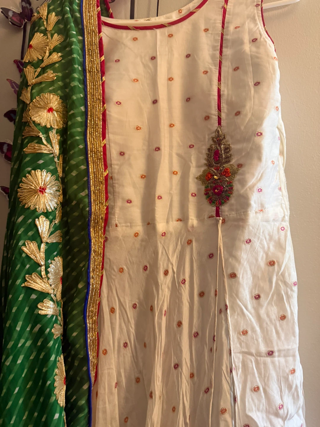 Beautiful traditional Indian salwar kameez suit. The set includes a long tunic top and a matching dupatta (scarf). The tunic is off-white with colourful embroidery, and the dupatta is green with gold detailing. Perfect for a special occasion or cultural event!