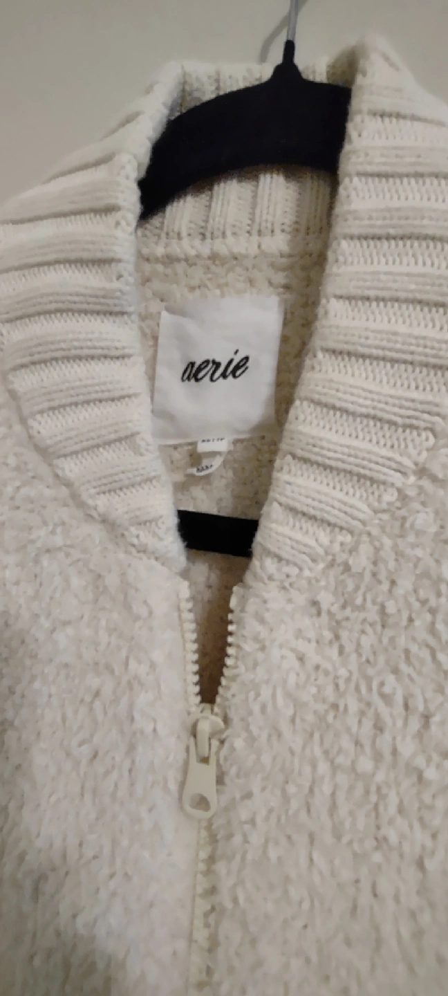 1000+Cozy up in this Aerie cream-coloured sherpa jacket! It's a petite size and features a full zip and ribbed detailing. Perfect for adding a layer of warmth and style to any outfit!