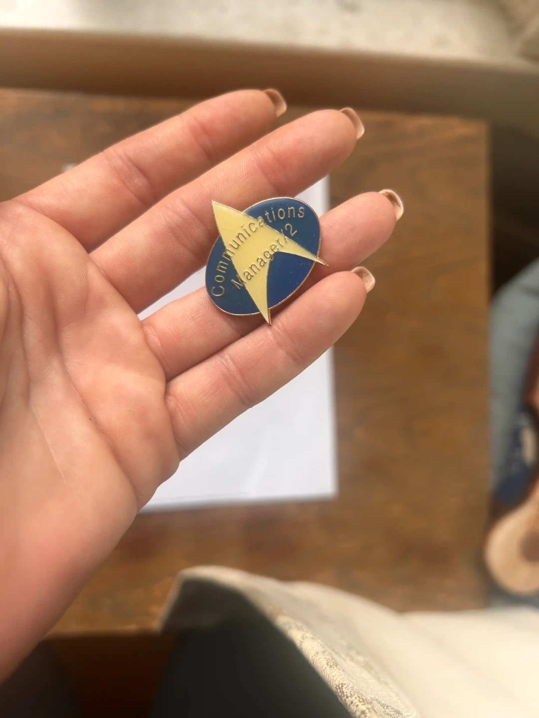 Selling a Star Trek Communications Manager pin. It's in great condition and features the iconic Star Trek insignia with the words "Communications Manager" encircling it. The back is marked with "©1998 PARAMOUNT PICTURES, THE HOLLYWOOD PINS, (310)471-8452". A must-have for any Star Trek fan or collector!