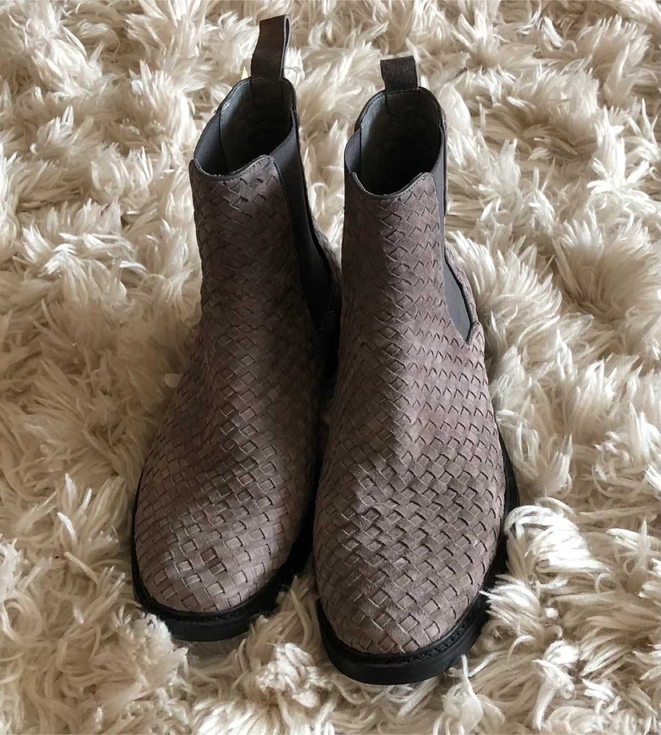 Here are some Marc Nolan Chelsea boots in a woven suede material. They are a comfortable choice for everyday wear. The boots feature a classic Chelsea boot design with elastic side panels and a pull tab at the back for easy on and off. The woven suede adds a unique touch to the traditional style