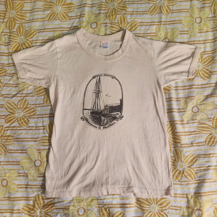 75the coolest vintage souvenir t-shirt from Halifax! featuring the iconic Bluenose II in a charming seascape design. printed on ringer style tee by the brand Golden label size S, pit to pit laying flat is just under 17in, length is just over 22in item is in great vintage condition, it has no signs of wear and I suspect it was bought on the trip in the 70s, and then only displayed. it has aged very well