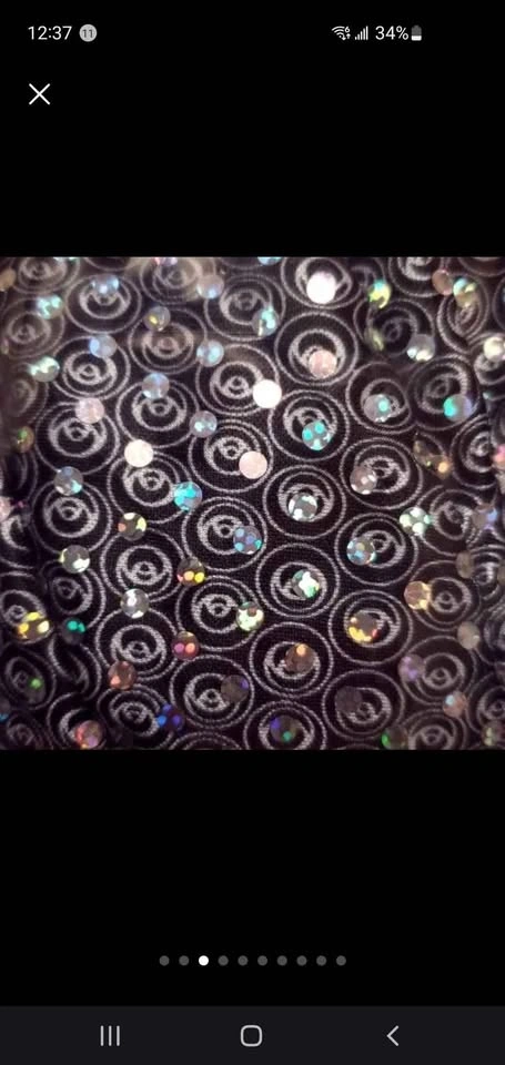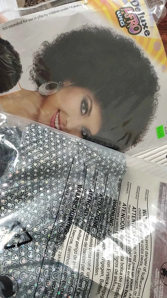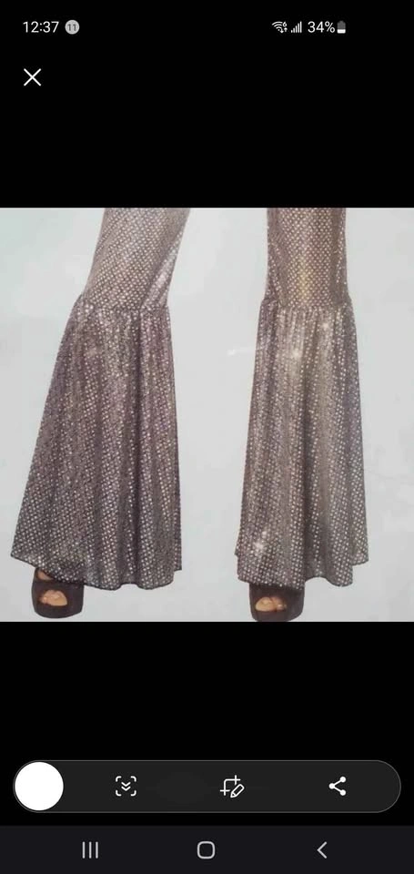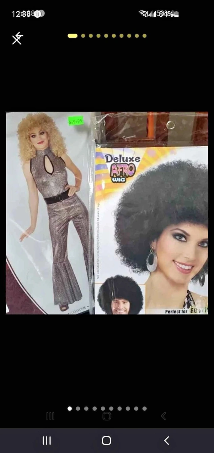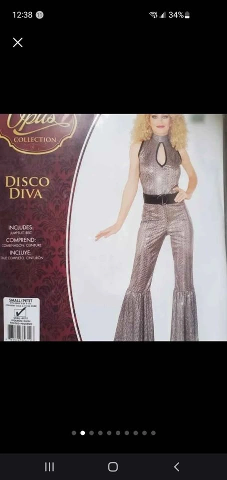 678Brand new! Never worn! WHOLE COSTUME. Size small, 6-10 with 'stretch'. Disco Diva shimmering sequin jumper with bell bottom flares AND black perm wig. These are quality costume pieces from Rubie's. Silver sequin jumpsuit is breathable and soft. Adjust the belt to your liking. Sparkles in the lights!!!! Perm Afro Wig is new in package and never worn, ready for a pick and to get down, groovy! St Clair West