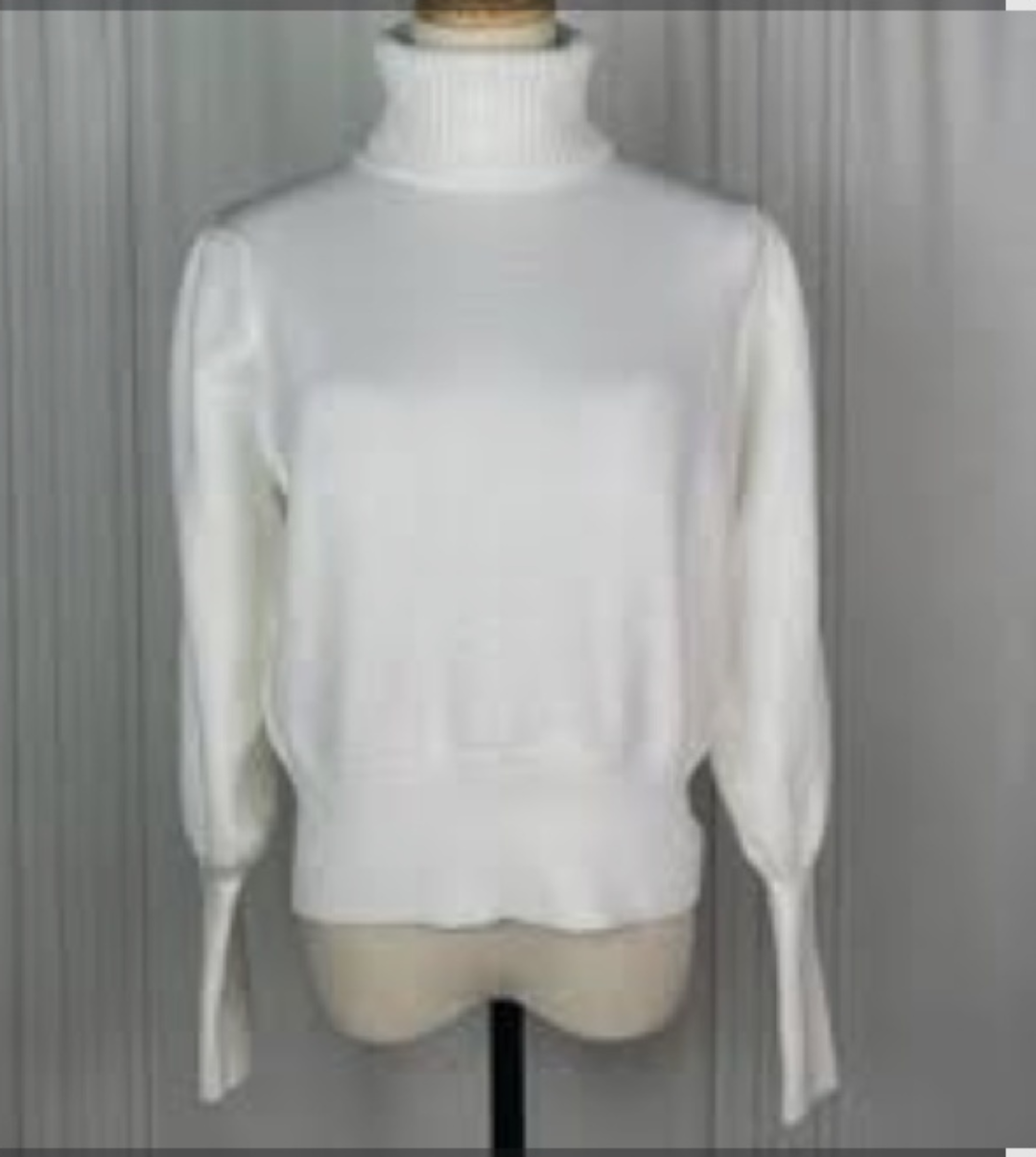 The sweater has unique puff sleeves, giving it an elegant and feminine touch. It can be found on several retail sites and is sometimes available in a "winter white" color.