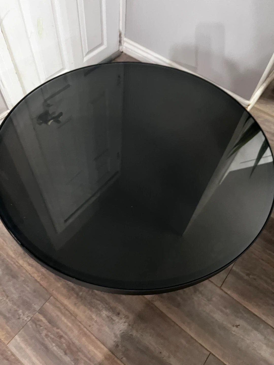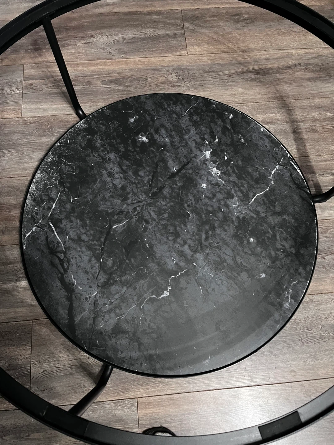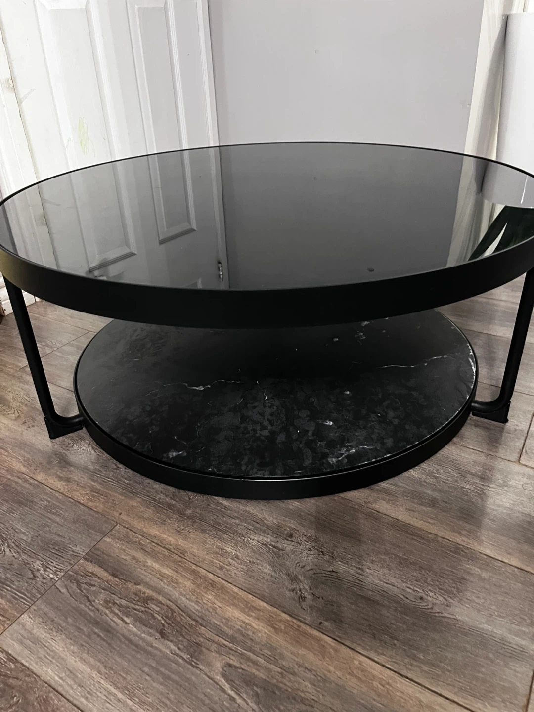 Round black metal coffee table with a black tinted glass top. It also features a second tier with a faux marble finish. It's in great condition and would look great in any living room.