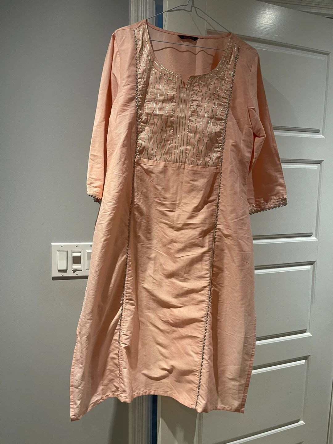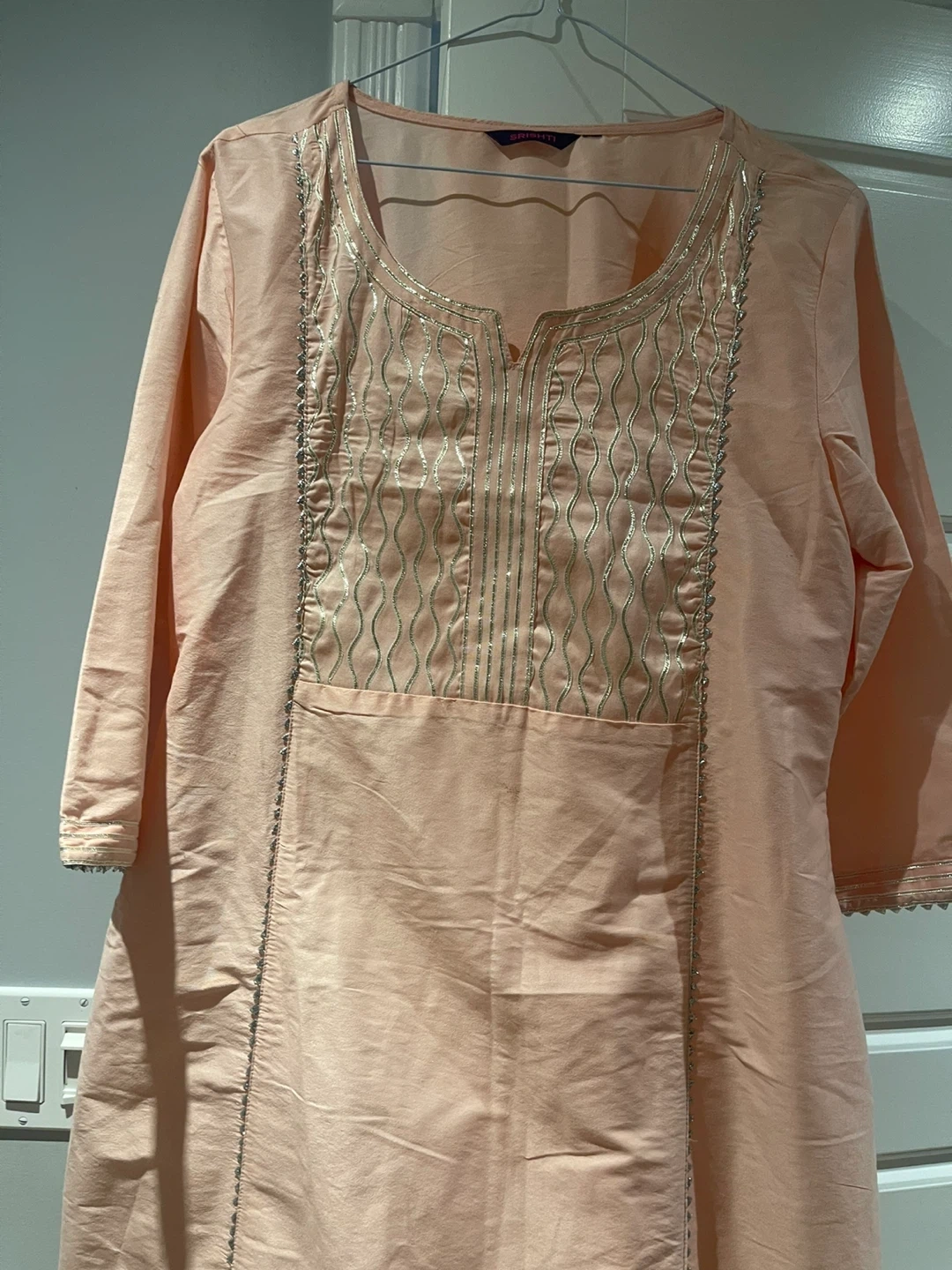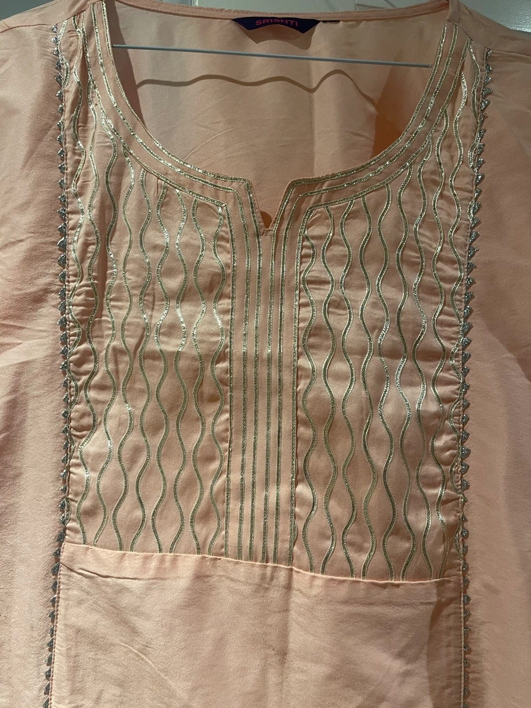 Selling a Srishti brand kurti in a lovely peach colour. It has beautiful silver detailing around the neckline and sleeves. Perfect for a casual or semi-formal occasion!