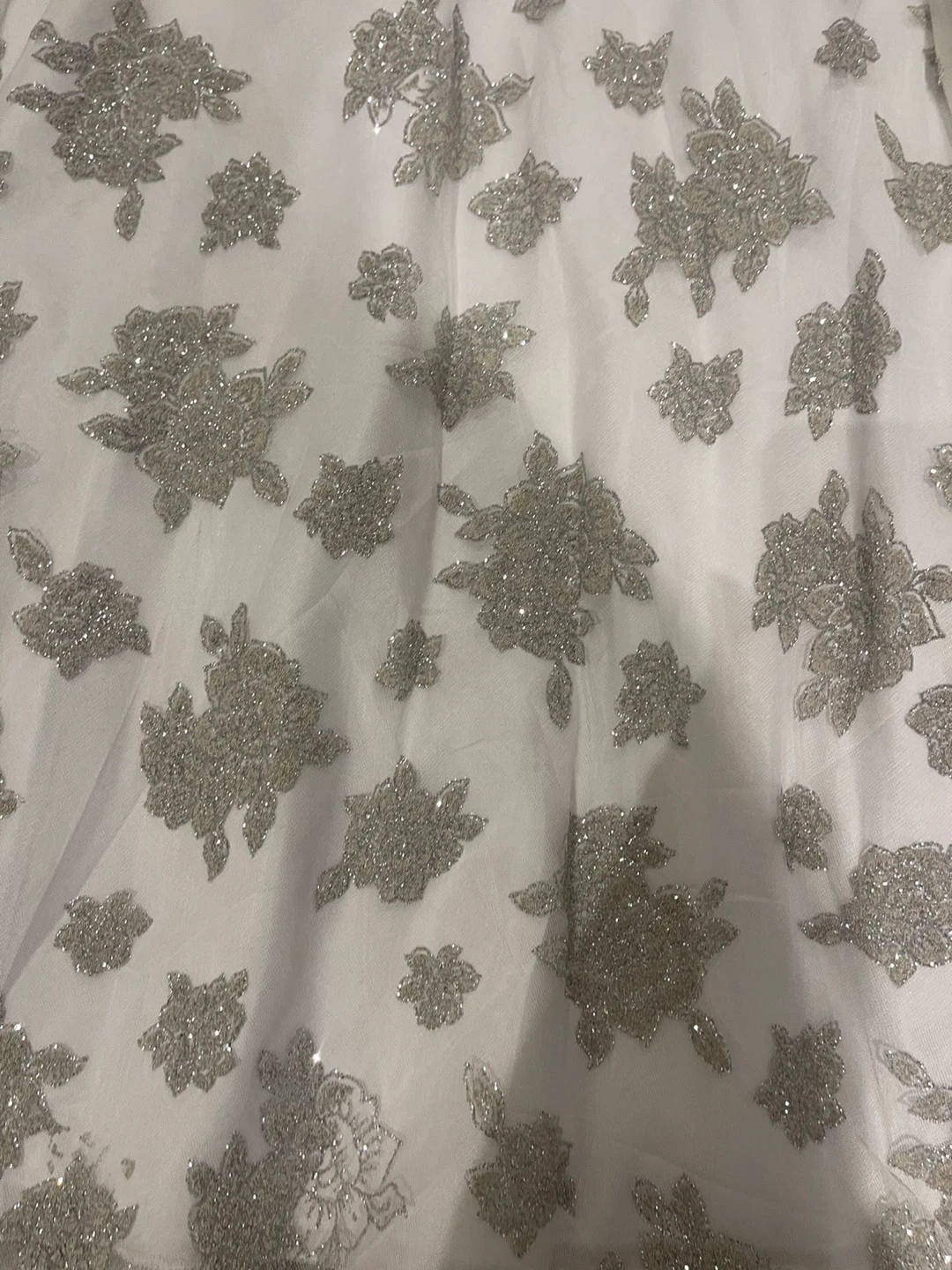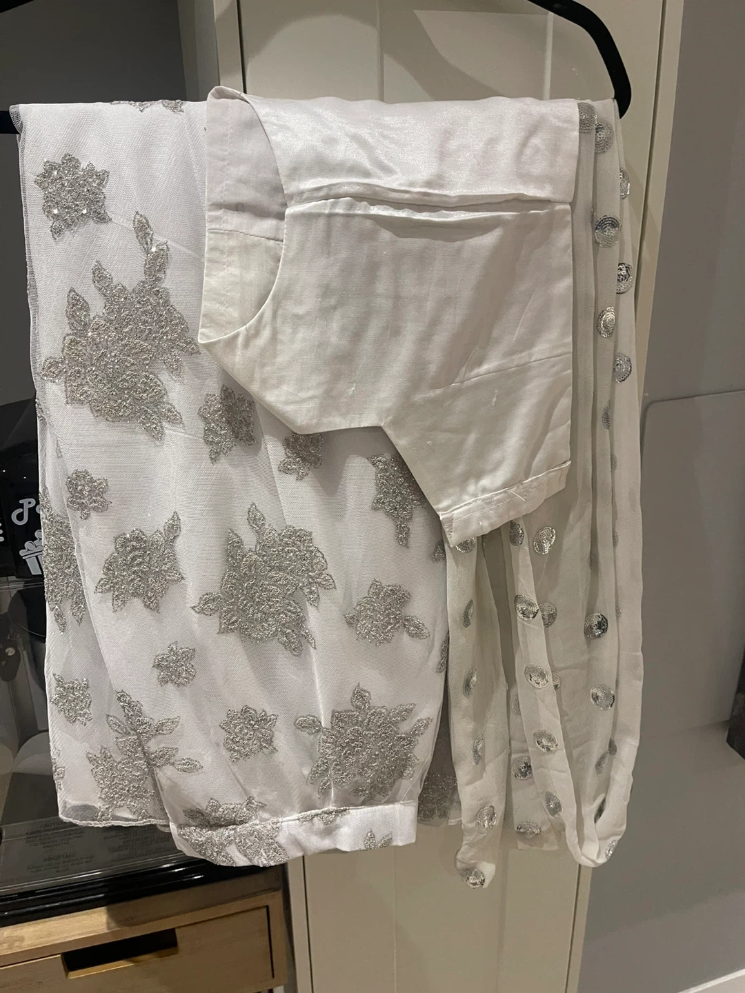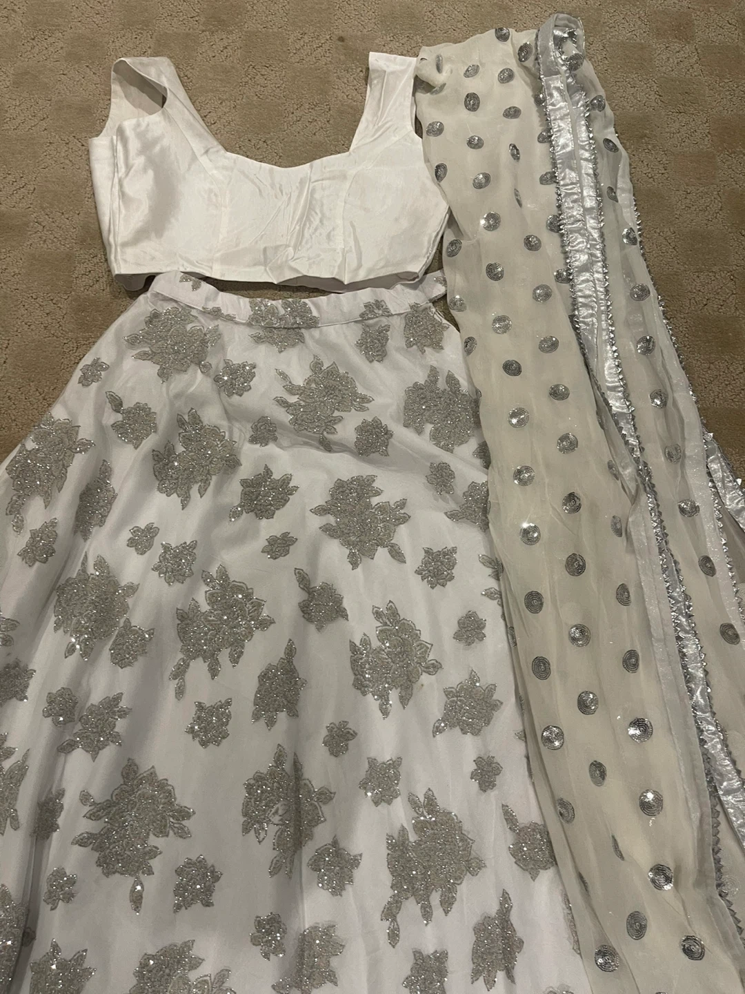 Selling a beautiful white lehenga choli set with silver floral detailing. It's a three-piece set, including the skirt (lehenga), top (choli), and dupatta. Perfect for a special occasion!