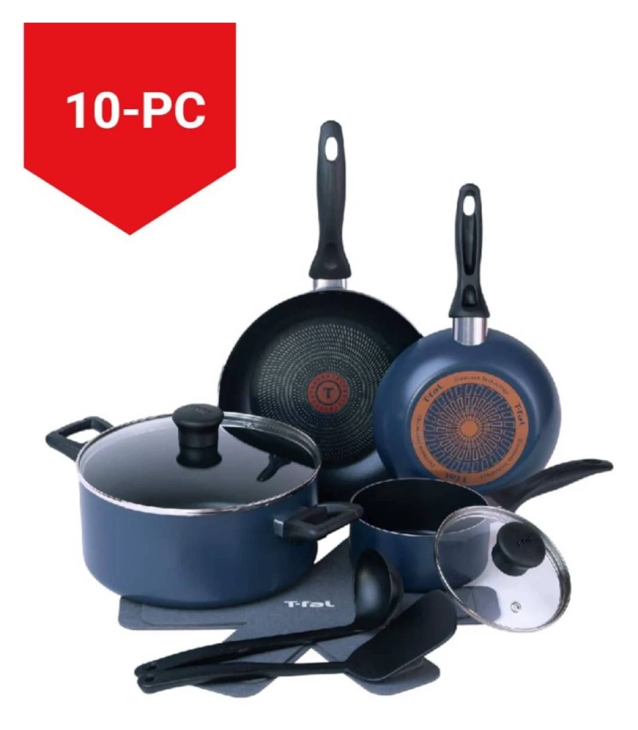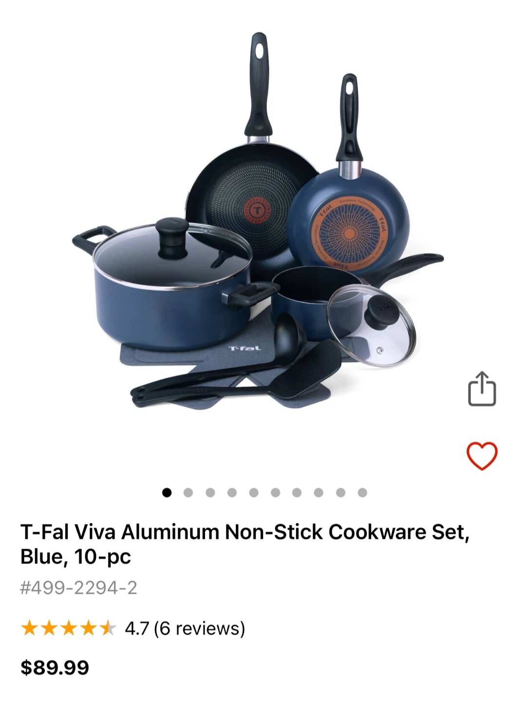 Selling a T-Fal Viva aluminum non-stick cookware set. This is a 10-piece set in blue. It includes pots, pans, lids, and utensils. Originally bought for $89.99