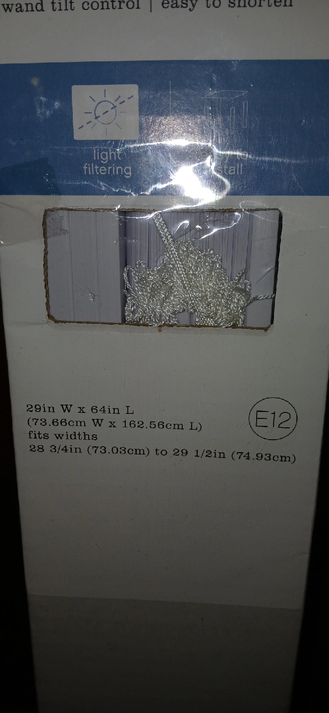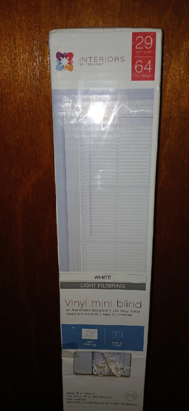 70Selling a white vinyl mini blind from Interiors by Design It's 29 inches wide and 64 inches long All hardware is included It has a wand tilt control and is easy to shorten