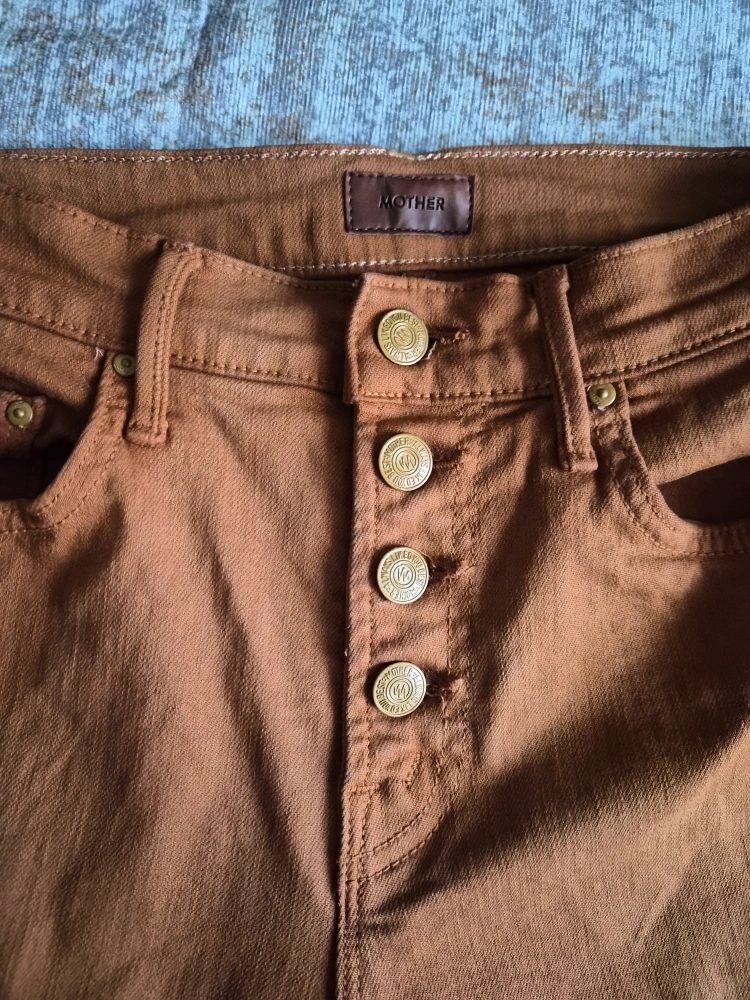 These are a pair of Mother The Pixie Insider Ankle Fray jeans in a lovely brown colour. They're a size 25 and are in great condition. Perfect for adding a touch of style to your wardrobe!
