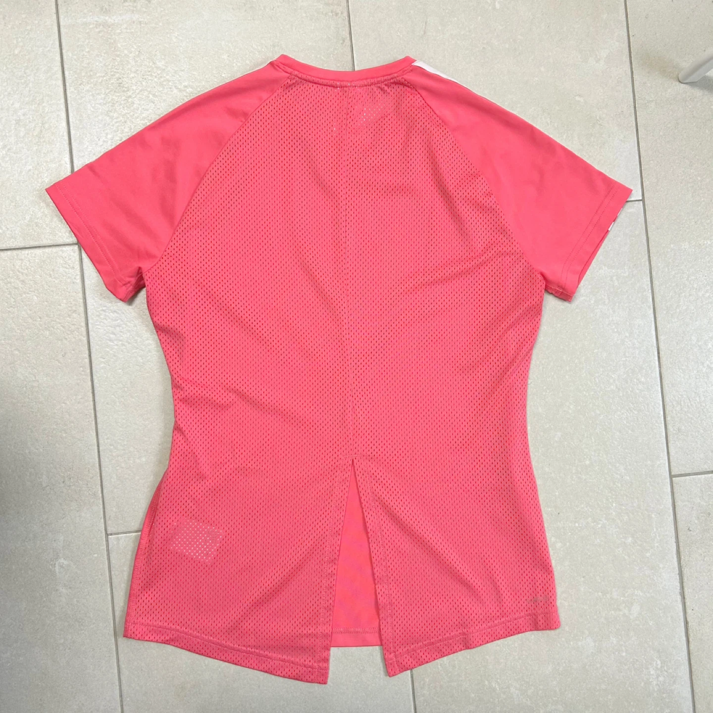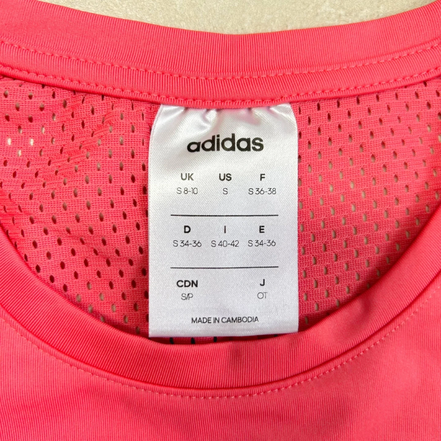 Selling a cute Adidas training t-shirt in a vibrant pink colour! It's a size small and features the classic three stripes on the sleeves. The back has a unique mesh design for breathability, perfect for workouts or casual wear!