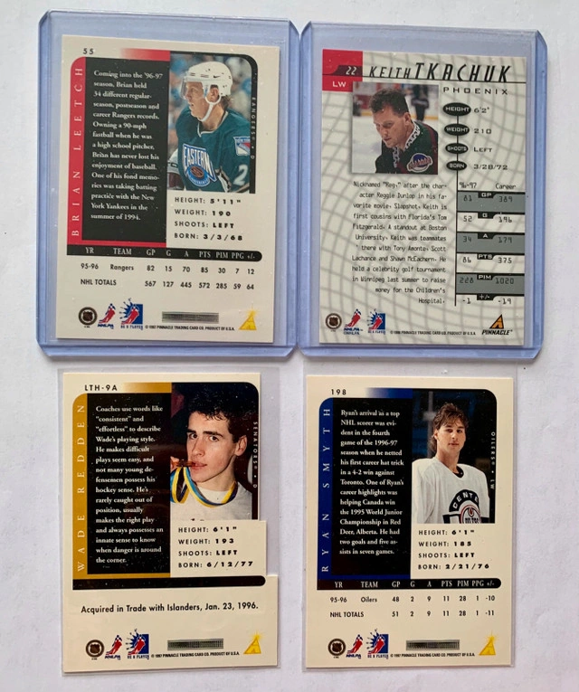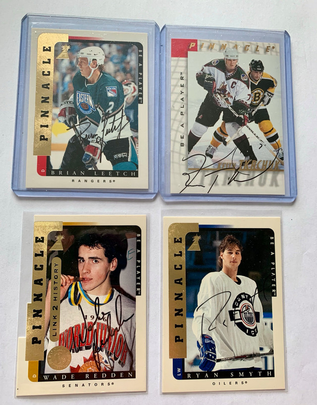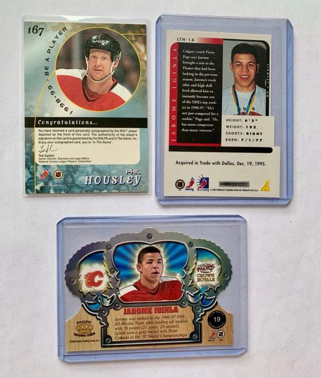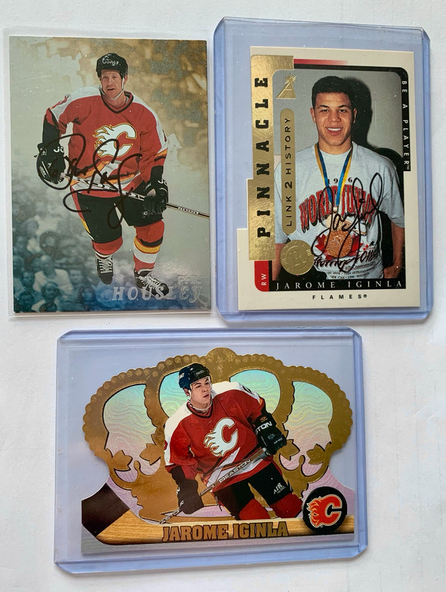 For sale are seven NHL cards, six of which feature autographs from Brian Leetch, Keith Tkachuk, Wade Redden, Ryan Smyth, Phil Housley and Jarome Iginla. Also included is a special Jarome Iginla Crown card. These cards are in excellent condition. I'm parting ways with these treasures from my collection! If the ad's still up, yes, it's available!