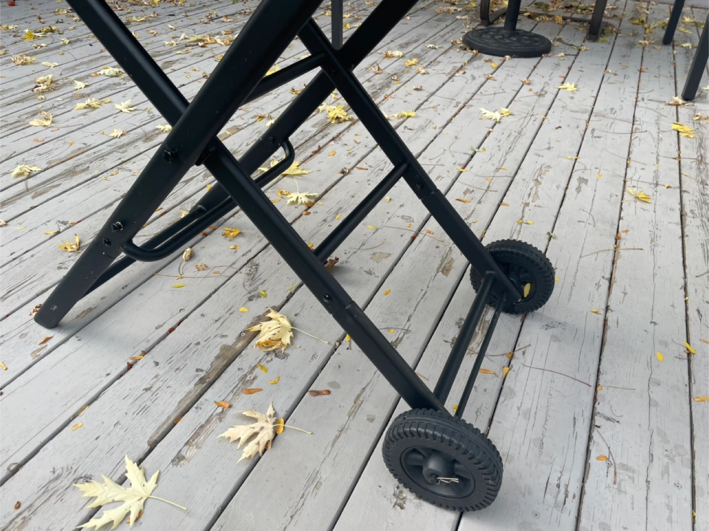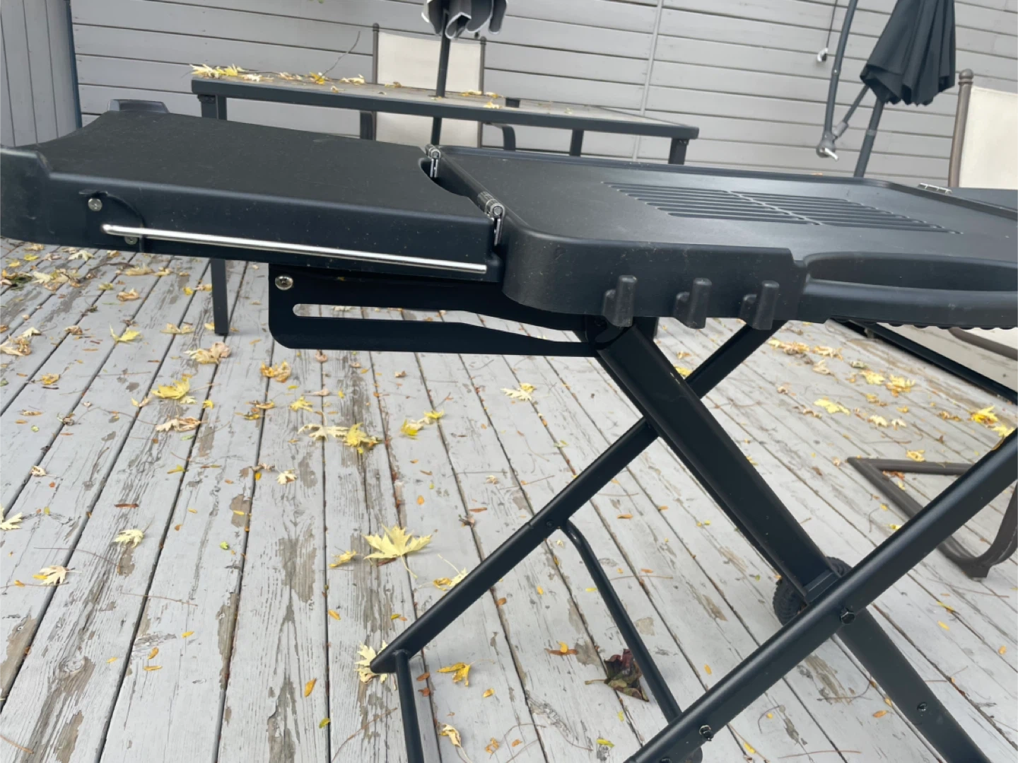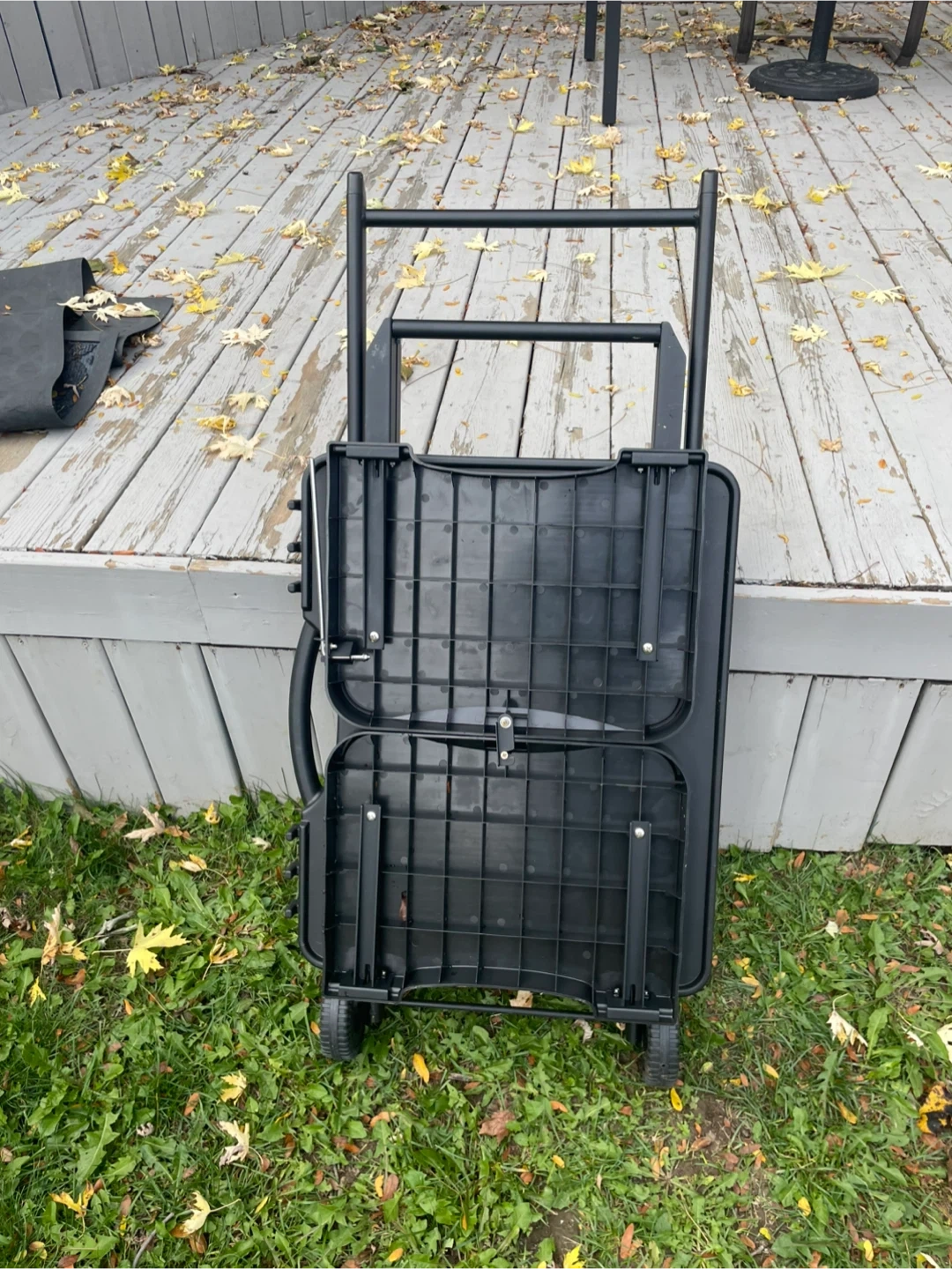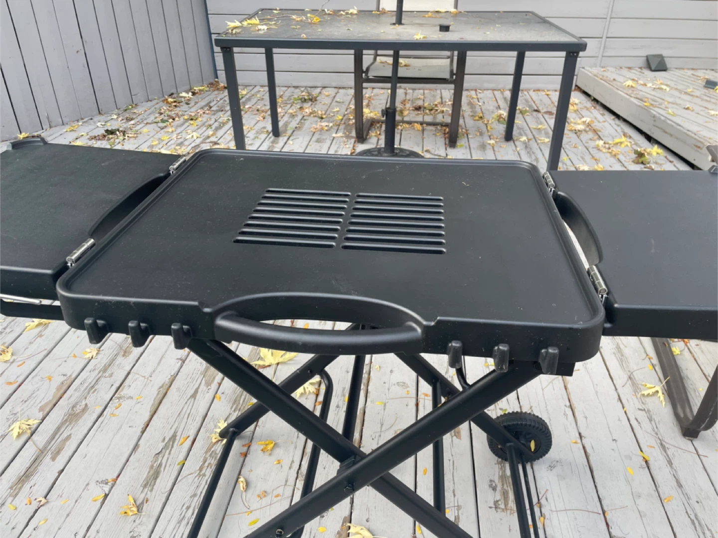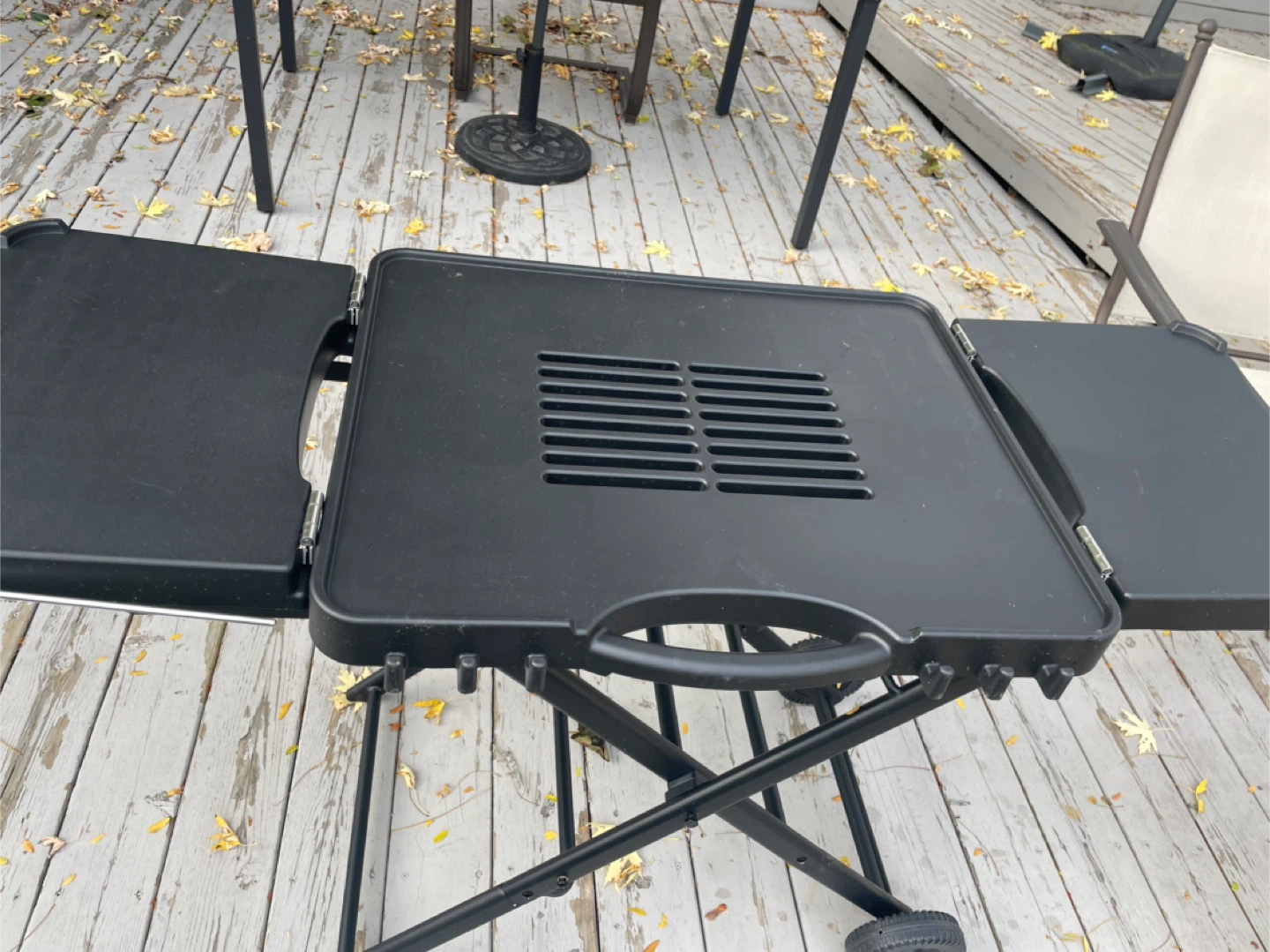 Selling a portable folding grill table in black. It's in great shape and perfect for outdoor cooking! It has a handle and wheels for easy moving around your backyard or patio