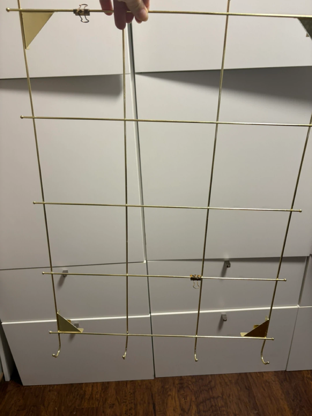 Selling a nice ikea gold-toned metal grid wall organizer. It has a minimalist design with hooks and clips, perfect for displaying photos, notes, or small items. It's in great shape and ready to add some style to your space!