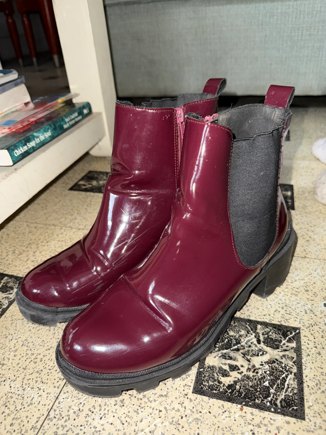 Giving away a pair of burgundy ankle boots. They are a size 8.5 and have a comfortable fit. Levante-04L. The boots show some signs of wear, but are still in good condition for everyday use! Perfect for adding a pop of color to your outfit. Smoke free home