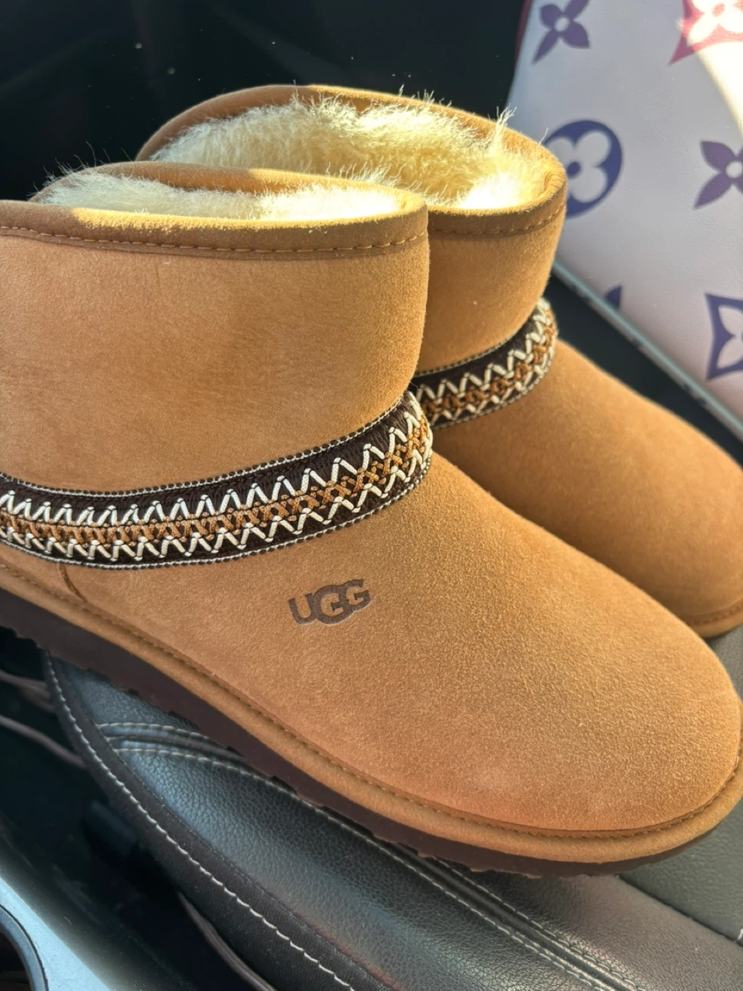 Selling a pair of UGG mini boots in a brown colour. They have a cute patterned band around the ankle. The boots are brand new!!!!!