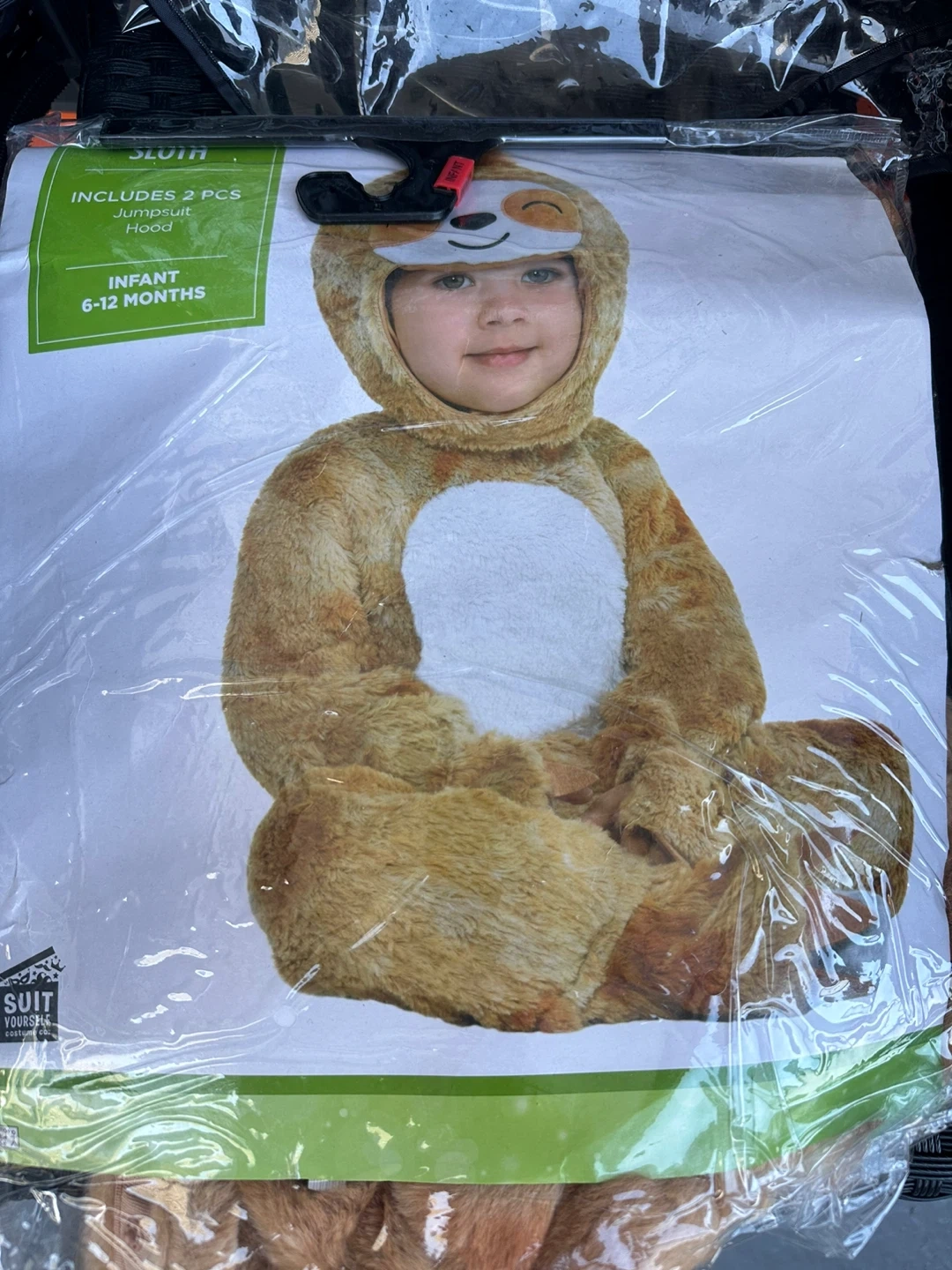 24Selling a super cute sloth costume for infants! It includes 2 pieces: a jumpsuit and a hood. Recommended for babies aged 6-12 months. Perfect for Halloween or dress-up!