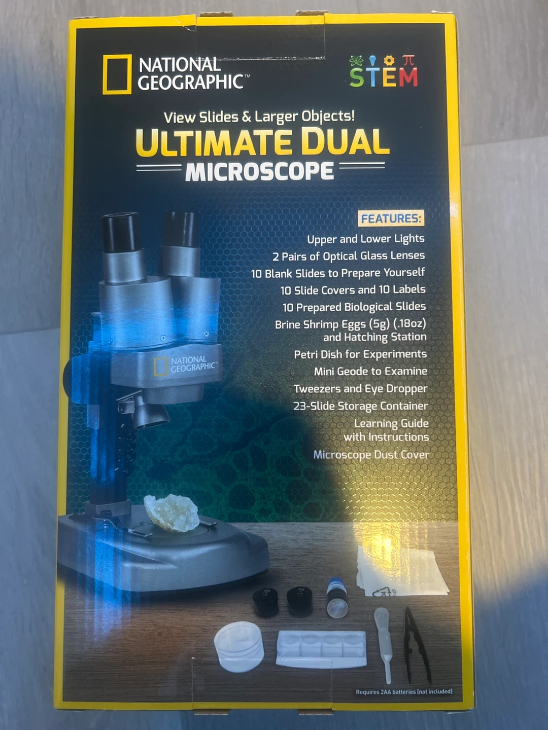I used it a few times and used very little of the brine shrimp eggs, you can barely tell. Selling a National Geographic Ultimate Dual Microscope set! This set includes over 50 accessories, including prepared and blank slides, brine shrimp eggs, a petri dish, tweezers, and an eye dropper. It also comes with a learning guide and instructions, plus a dust cover to keep everything clean. The microscope has upper and lower lights and two pairs of optical glass lenses. Box included!