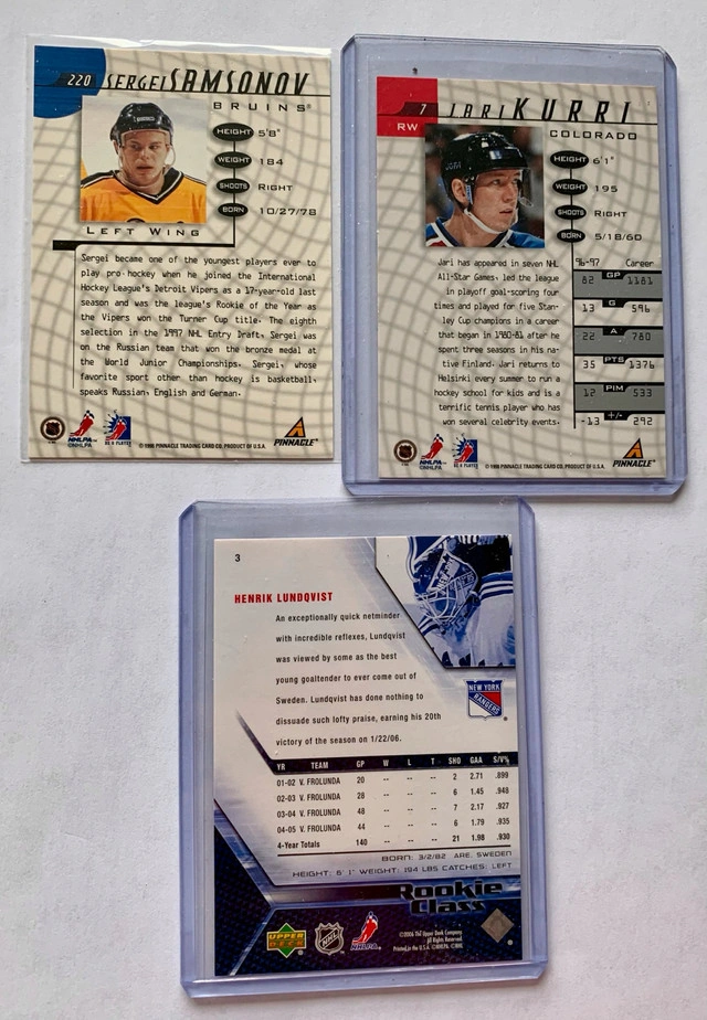 For sale are seven NHL cards, including six autographs and one rookie card, all in excellent condition. The autographs include Alex Louis MacInnis, Jarome Iginla, Ryan Smyth, Luc Robitaille, Sergei Samsonov Rookie Card, and Jari Kurri. Also included is a Henrik Lundqvist Rookie Class card. These cards have been kept in protective cases. If the ad is still up, yes, they're still available! These cards are just waiting to find their way into the hands of a dedicated hockey fan like yourself!