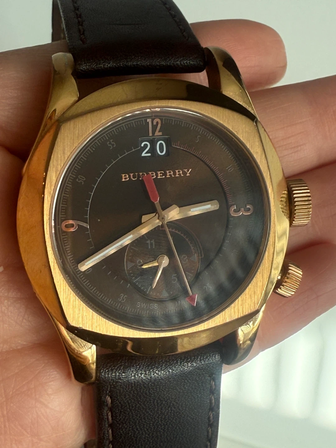 Selling a Burberry watch with a gold case and black leather strap. It's in great condition and has a classic, stylish look! The back of the watch says Burberry Established 1856 and Swiss Made