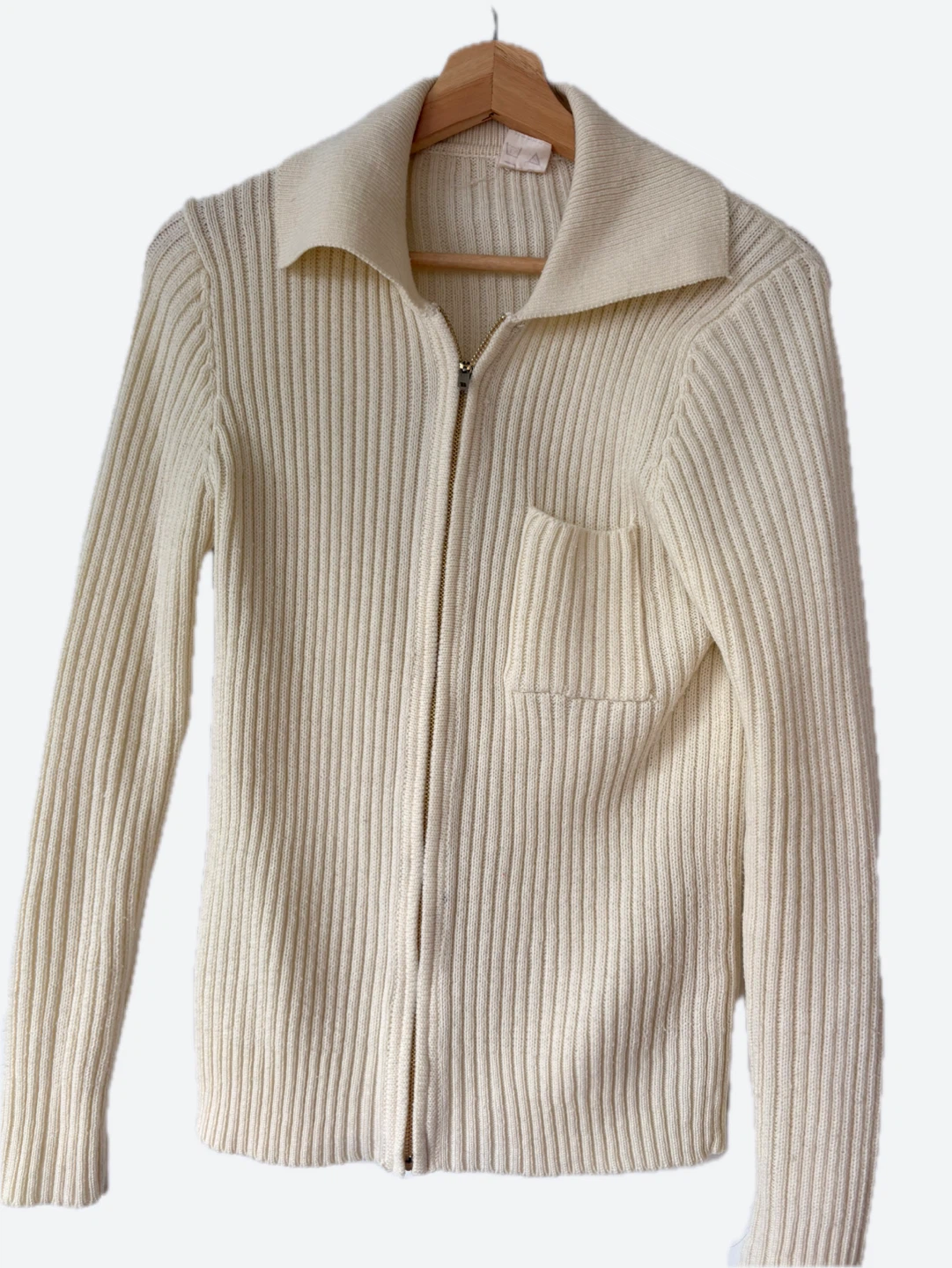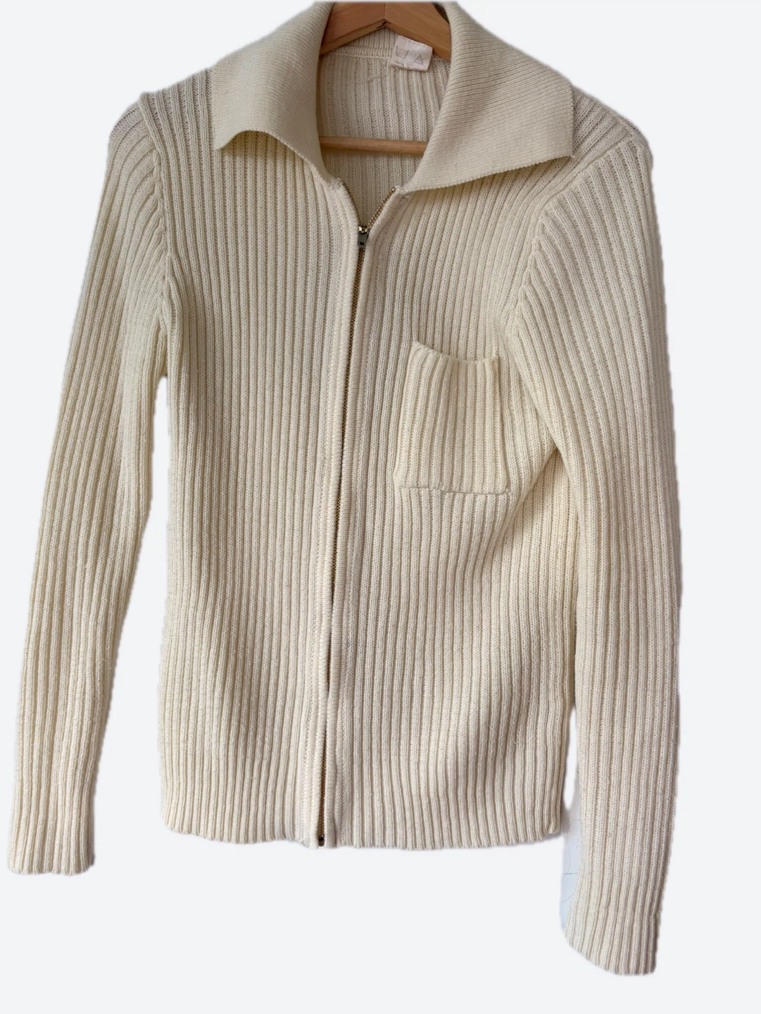 Wool Cozy up in this cream-coloured knit cardigan! It features a full zip and a stylish collar, perfect for layering. The ribbed texture adds a touch of sophistication to this versatile piece. It also has a small pocket on the front, check it out more cheap items on my shop