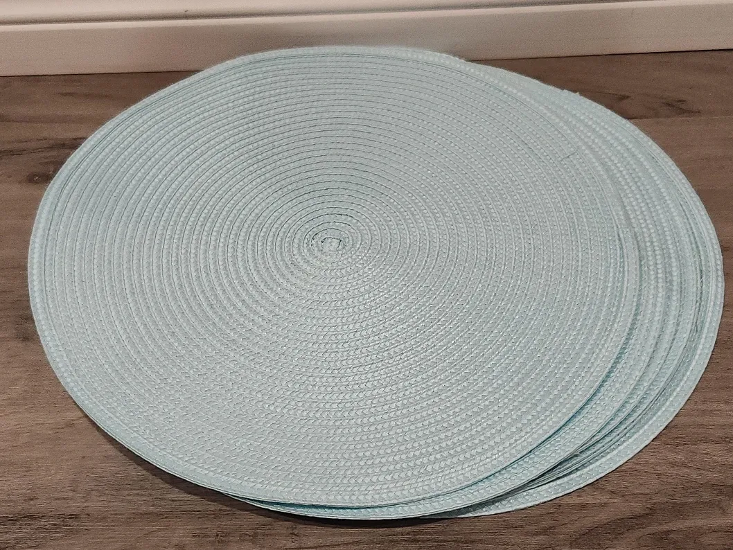 Selling a set of 6 brand new round woven placemats. In a versatile shade of light blue and measuring 15" across, it is functional while adding a touch of elegance and charm to your dining table. Easy care, simply wipe clean.