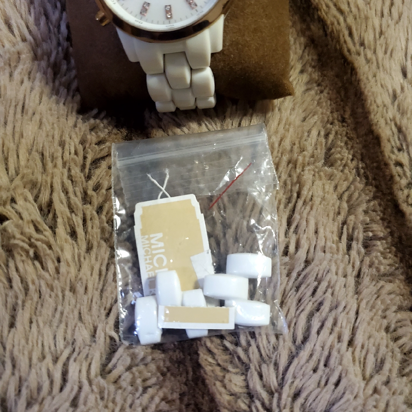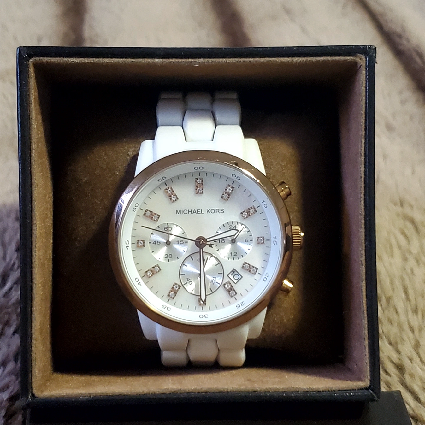 Selling a beautiful Michael Kors ladies watch! It features a white ceramic band and a stunning face with crystal accents. Comes with the original box and extra links to adjust the size. It's in great condition and ready for a new home! comes with a nice box and extra pieces. new and kept nice. not used. asking $130