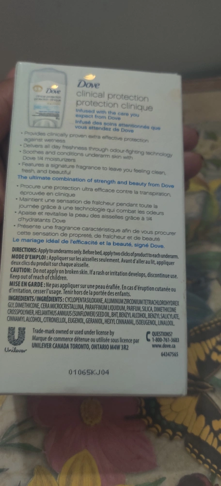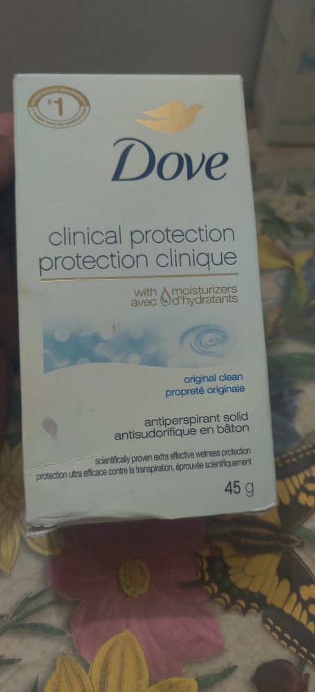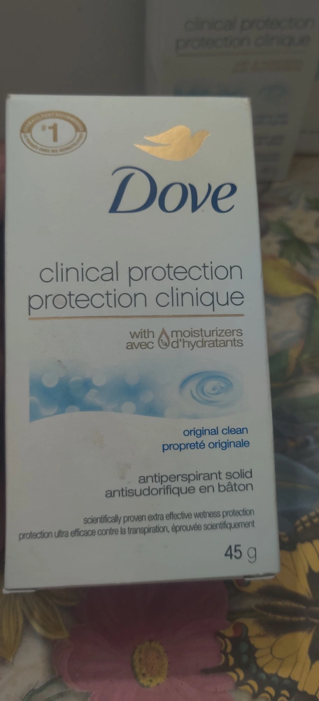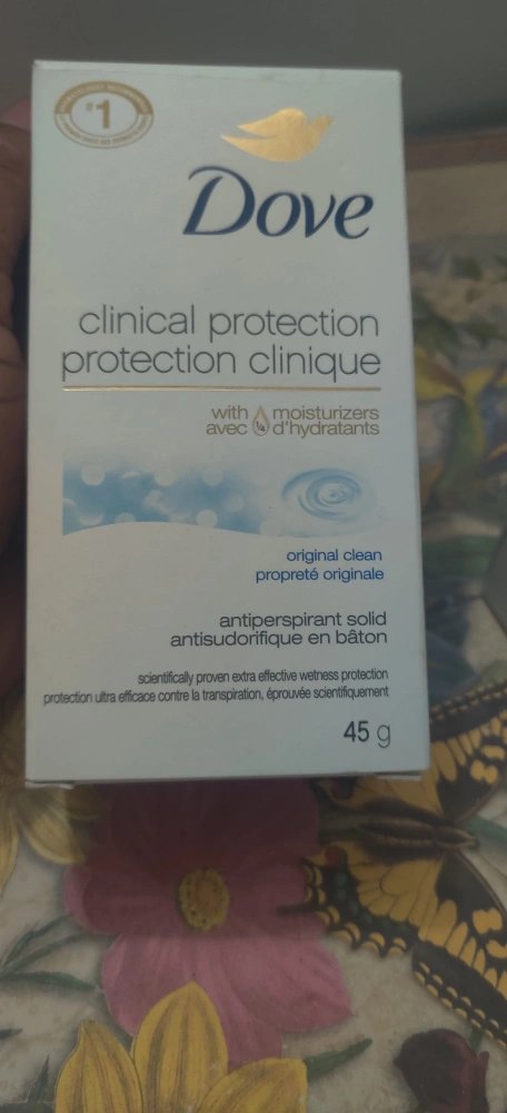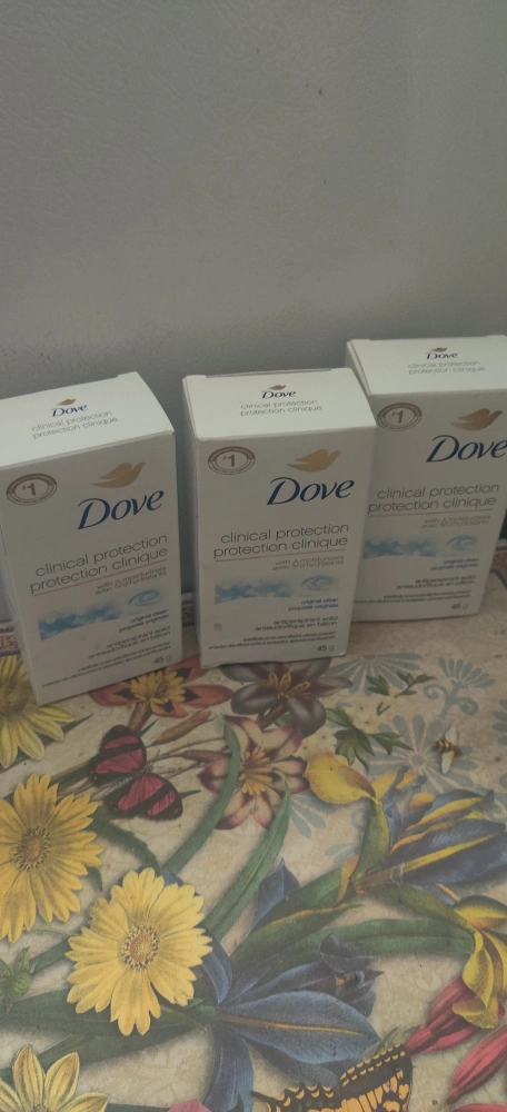 1000+Selling 3 Dove Clinical Protection antiperspirant in the original clean scent. It's an antiperspirant solid in a 45g size. Provides clinically proven extra effective protection and delivers all-day freshness with odour-fighting technology. Soothes and conditions underarm skin with Dove 1/4 moisturizers