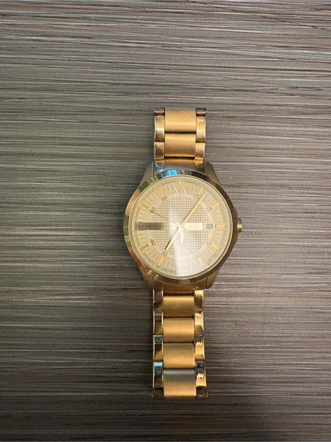 Selling a gold Armani Exchange watch. It's in good condition with some signs of wear. The watch has a classic design and is perfect for everyday wear or special occasions. It's a stylish accessory to complete any outfit!