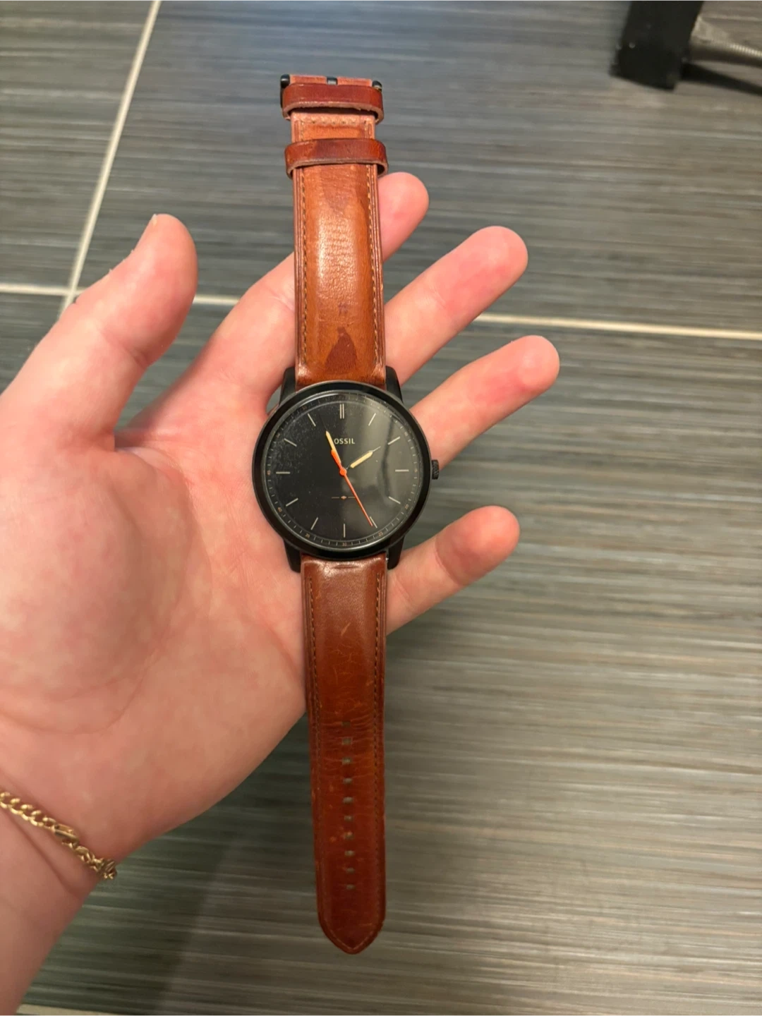 Selling a Fossil watch with a stylish brown leather strap! The watch features a classic design with a black face and contrasting hands. It's in good condition and ready to be worn. A great accessory for any outfit!