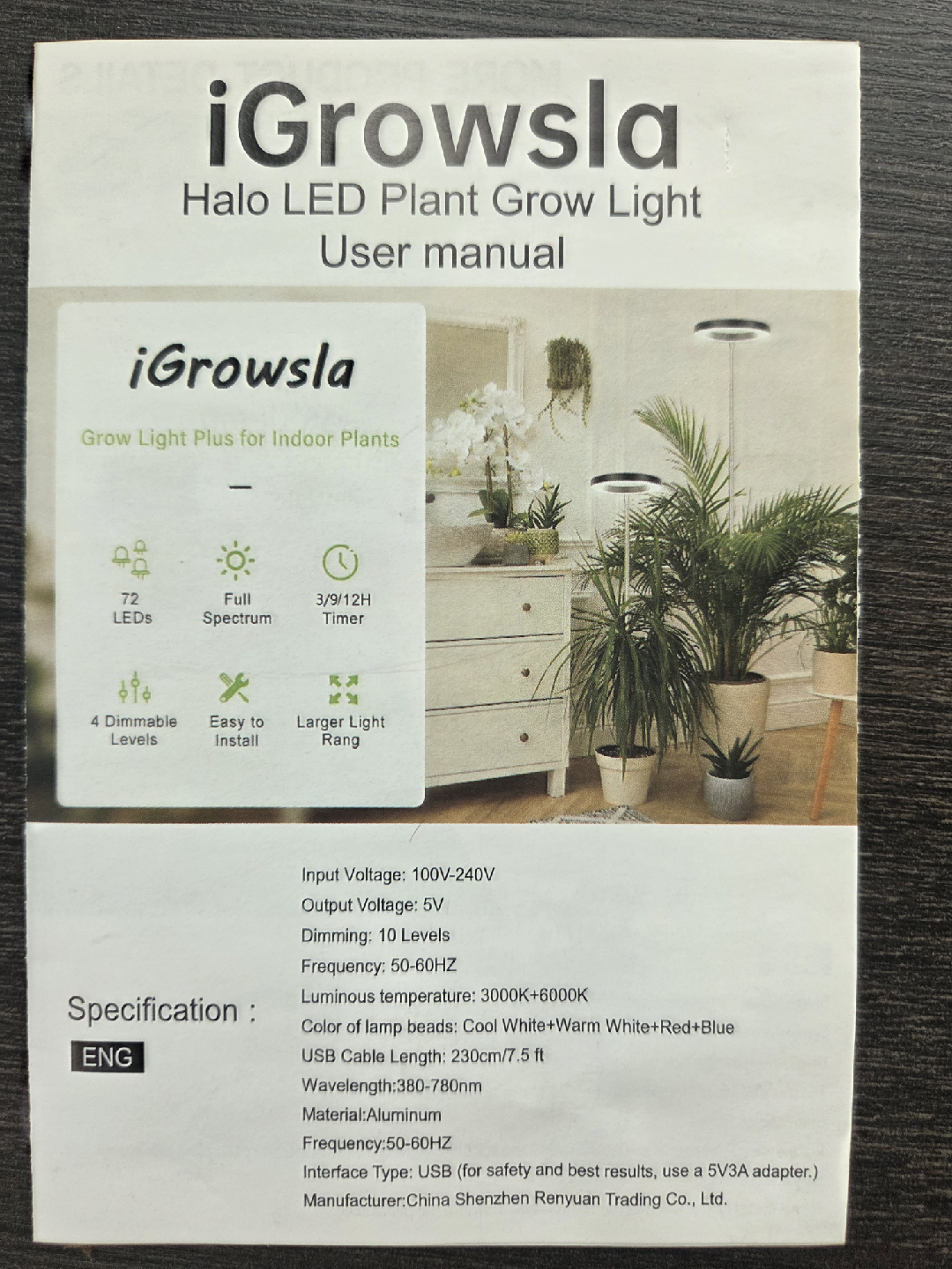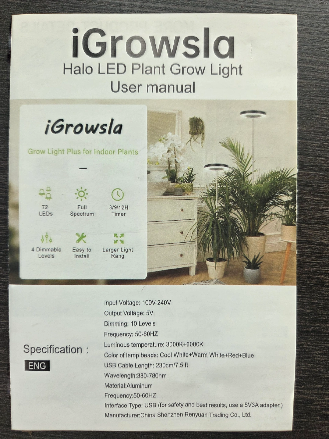 Check out this iGrowlsla Halo LED Plant Grow Light! It's great for indoor plants and comes with a user manual.