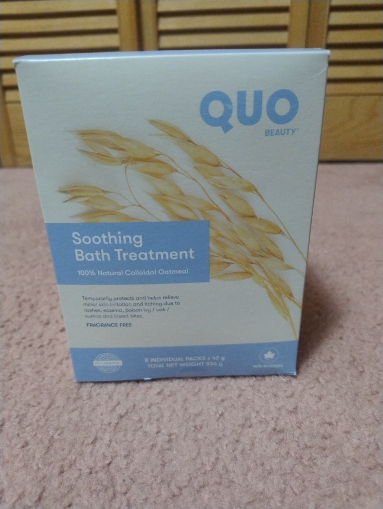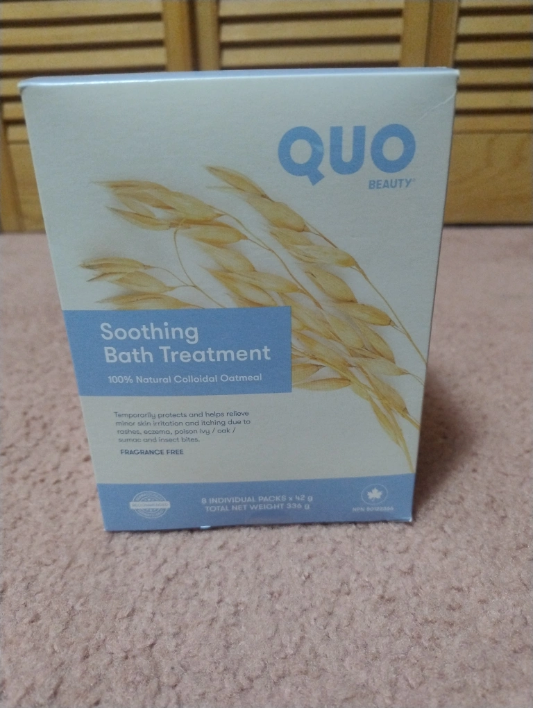 Selling a brand new QUO Beauty Soothing Bath Treatment! It's 100% natural colloidal oatmeal, fragrance free, and comes with 8 individual packs x 42 g (total net weight 336 g). Temporarily protects and helps relieve minor skin irritation and itching due to rashes, eczema, poison ivy/oak/sumac, and insect bites