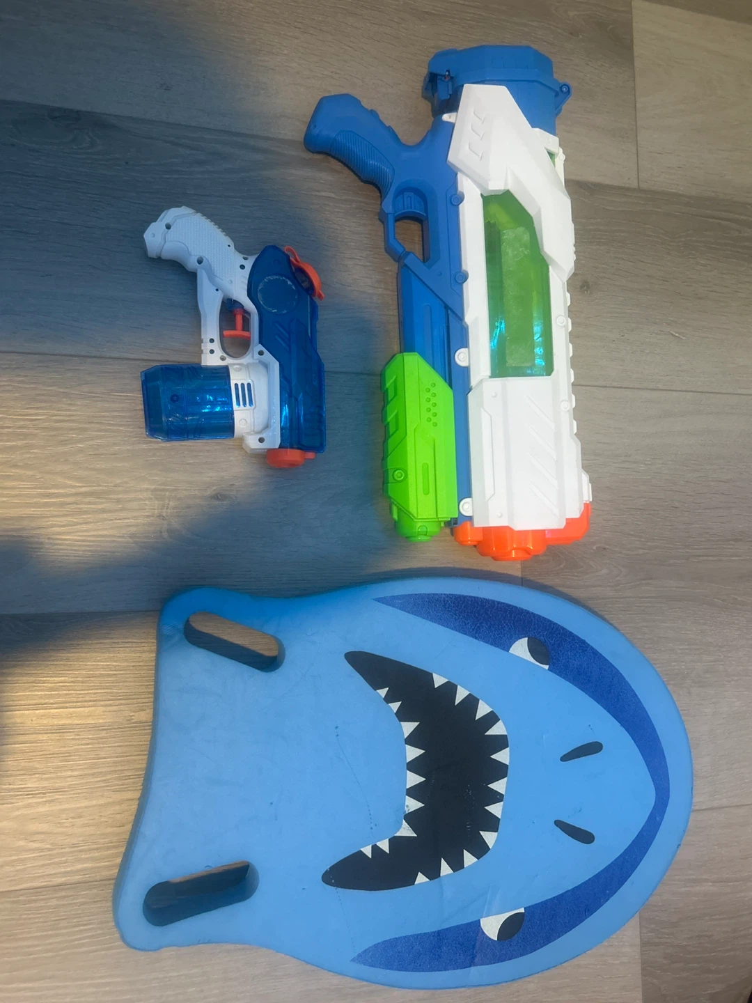 Selling a couple of water guns and a blue shark-themed body board. Ready for some fun in the sun! Retail: $20,$5,$5