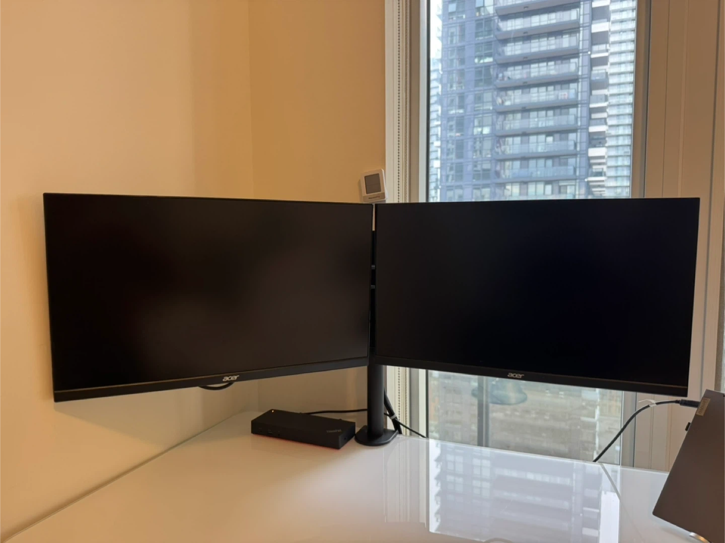 329Selling a dual monitor stand! It's in great shape and perfect for setting up a home office. It helps free up desk space and allows for better ergonomics by adjusting the height and angle of your monitors. Easy to install and use, it's a great addition to any workspace