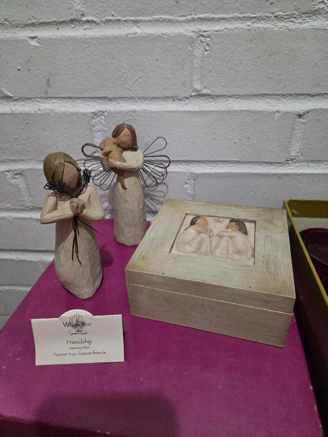 168Selling a Willow Tree 'Friendship' Memory Box along with two Willow Tree figurines. The box features an embossed design of two figures, and the figurines are in good condition. Perfect for gifting or adding a touch of sentiment to your space.