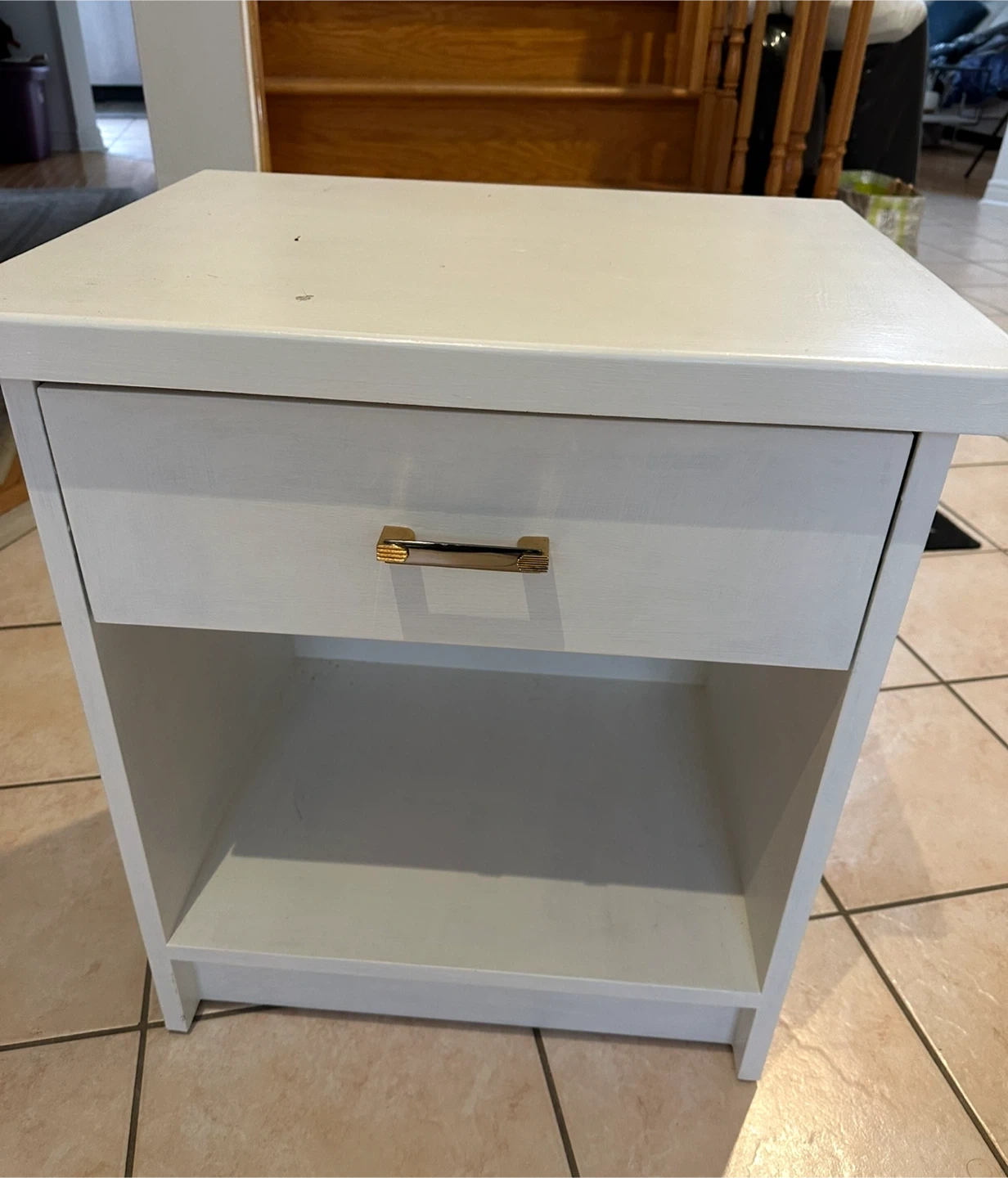 Selling a cute little white nightstand! It has a drawer and an open shelf below, perfect for bedside storage. It's in good condition and would look great in any bedroom or as a side table in a living room