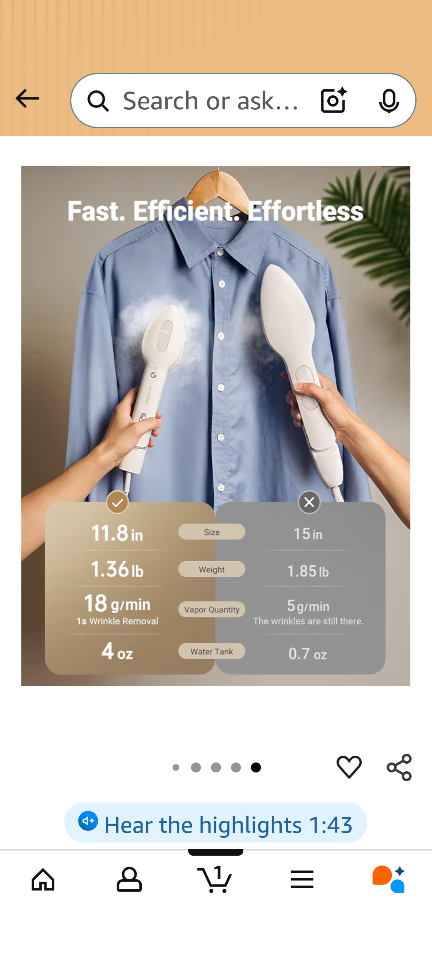 The steamer is 11.8 inches in size, weighs 1.36 lb, and has a 4 oz water tank