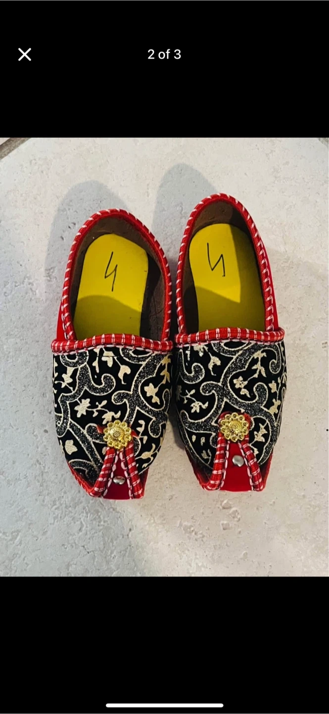 These are a pair of handmade slip-on shoes, perfect for adding a unique touch to your outfit! They feature beautiful embroidery and are in size 4.