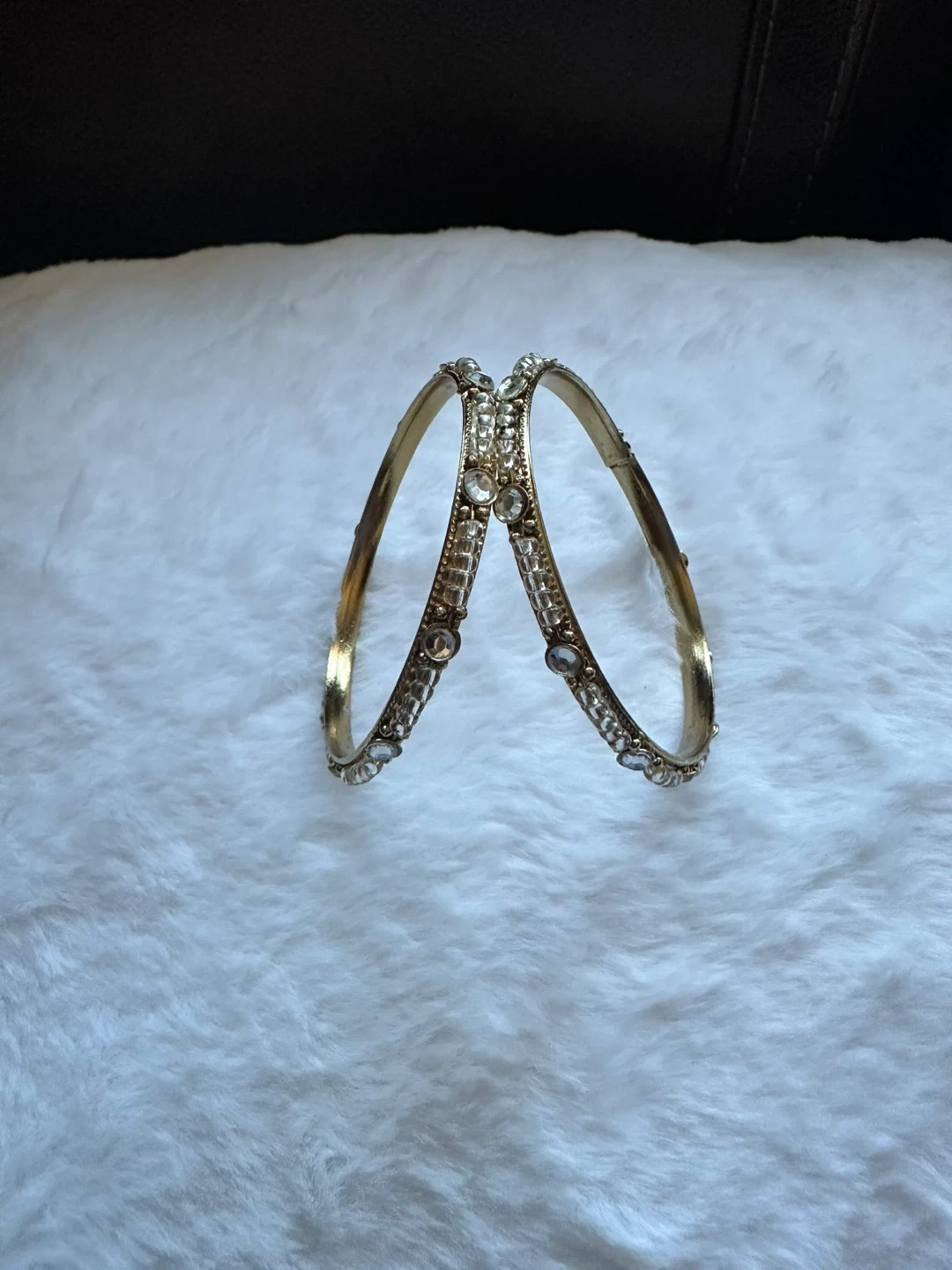 Selling a set of two gold-tone bangles, each adorned with sparkling rhinestones. They're in great condition and will add a touch of elegance to any outfit!