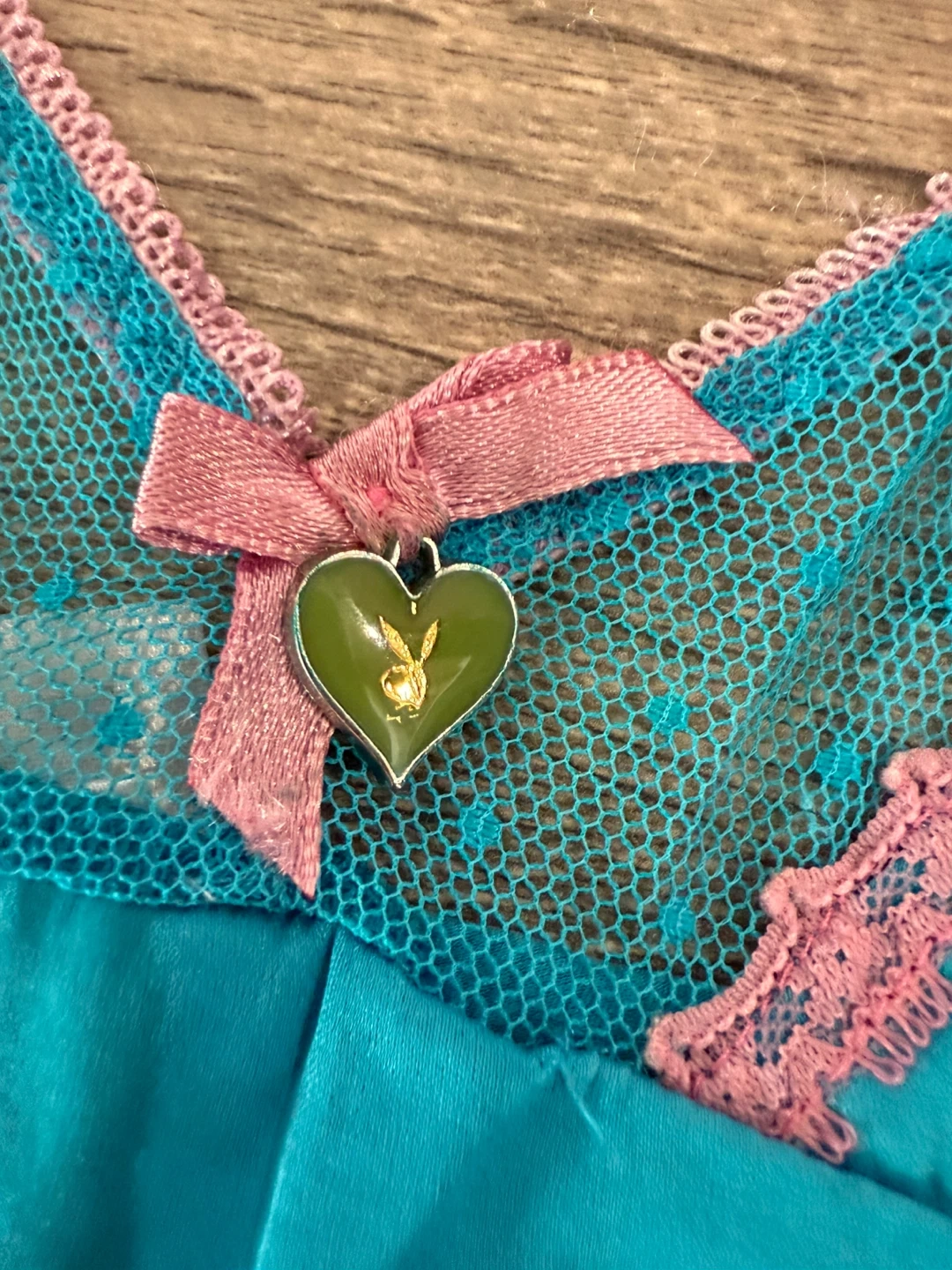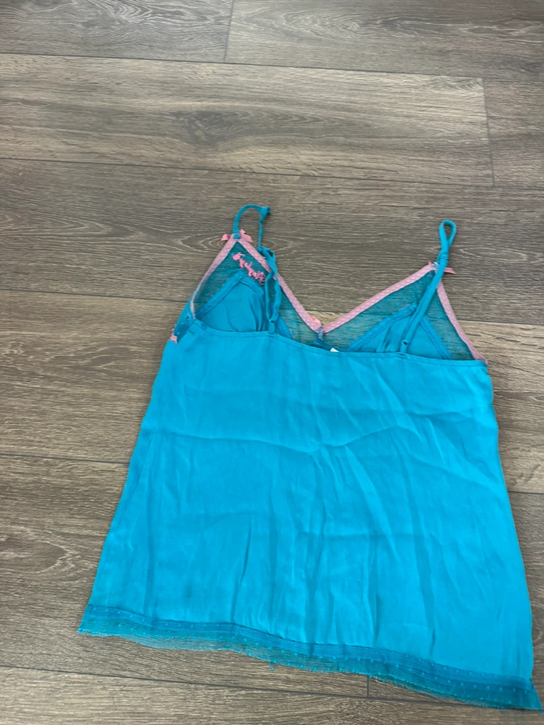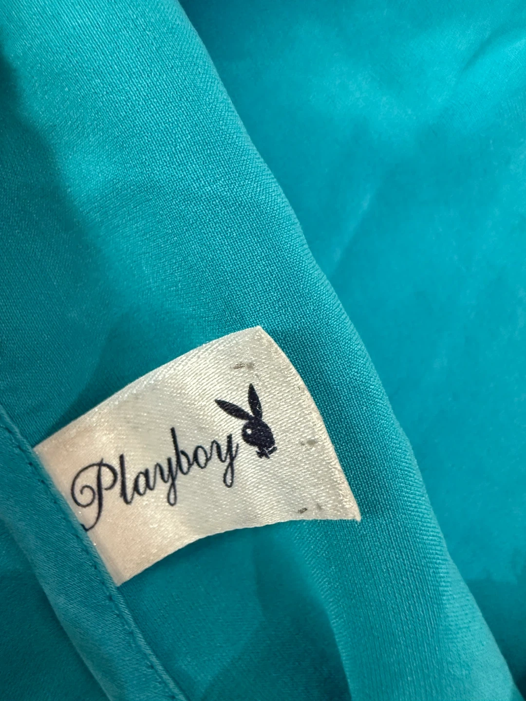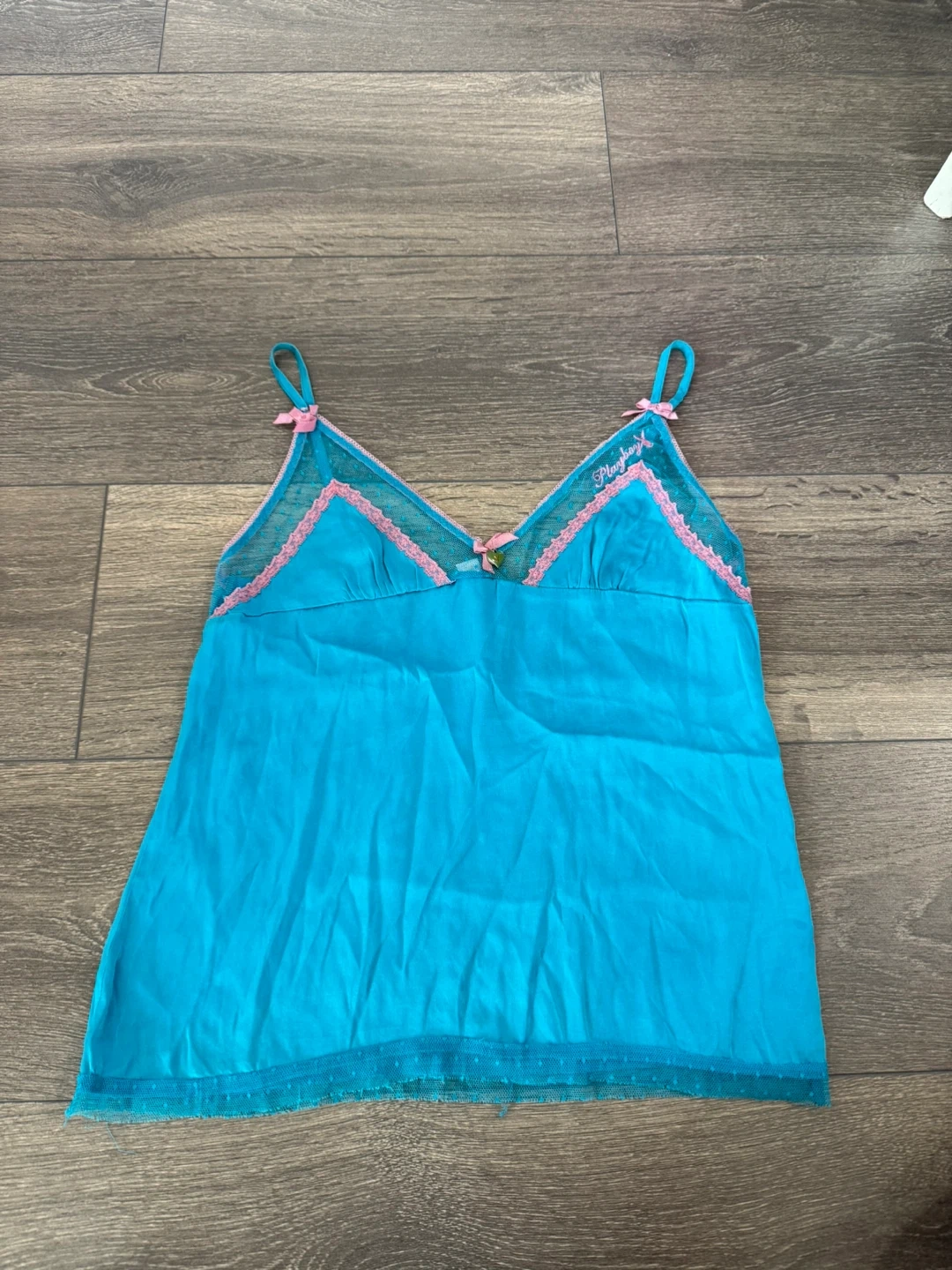 108Cute Playboy cami top in a vibrant blue colour! It's a size small and made of 93% silk and 7% spandex, making it super comfy. The top has a cute pink bow and lace trim, plus the iconic Playboy bunny logo. Perfect for lounging or layering!