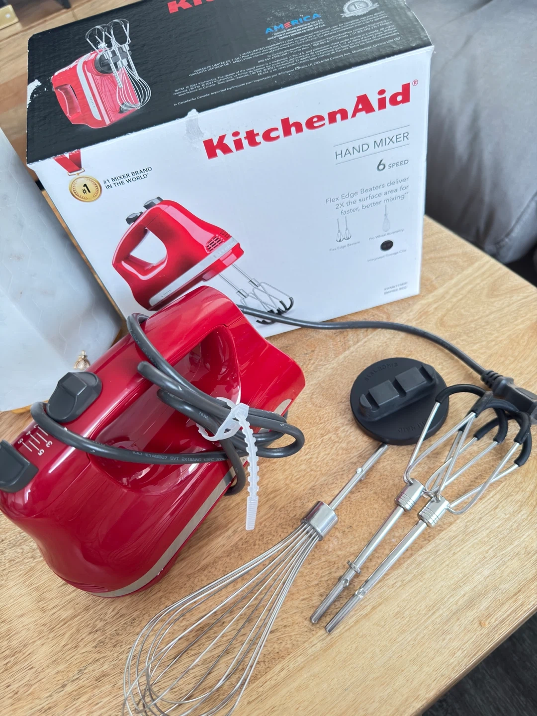 Selling a KitchenAid hand mixer with 6 speeds! It comes with the Flex Edge Beaters that deliver 2X the surface area for faster, better mixing. Also included is a Pro Whisk Accessory and an integrated storage clip. The box is included.