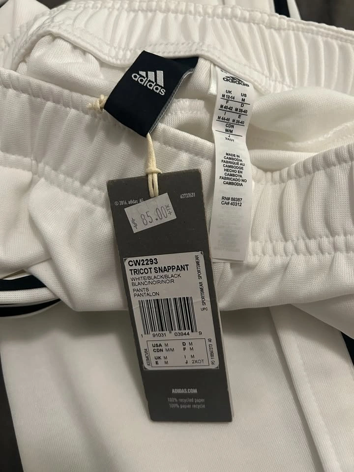 15The tag and sizing are for Menswear but truly work on anyone - unisex white pants. Never worn other than to try on - tags attached. Brand: Adidas. Style: Tricot Snap Pant. Size: Medium