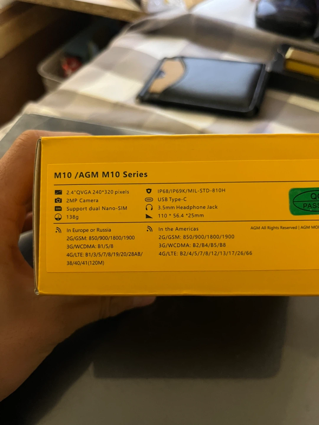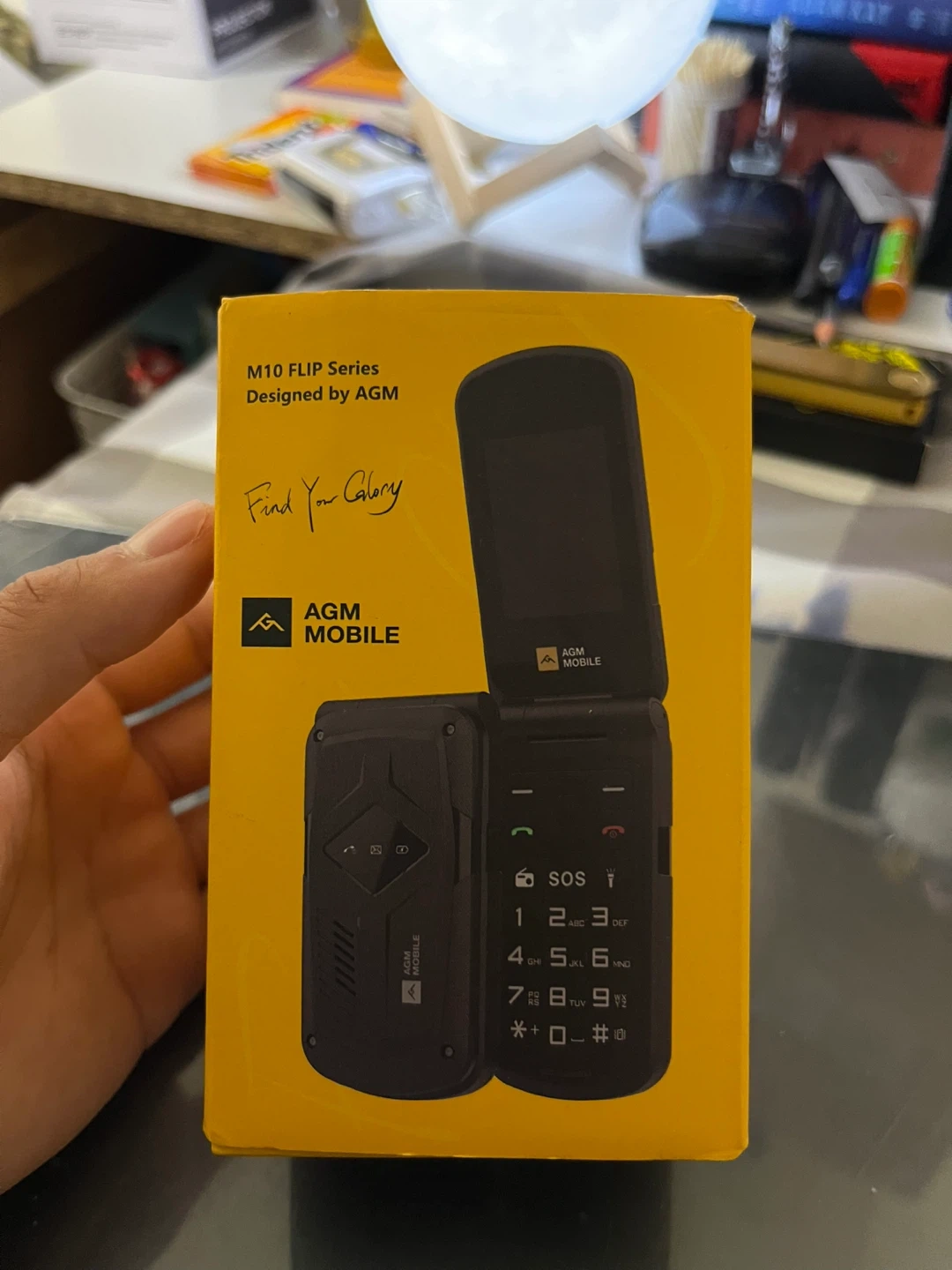 Selling an AGM M10 Flip Series mobile phone. It comes with the box. Key features include a 2MP camera, support for dual Nano-SIM, USB Type-C, and a 3.5mm headphone jack. Dimensions are 110 * 56.4 * 25mm. Dm if you’re interested.