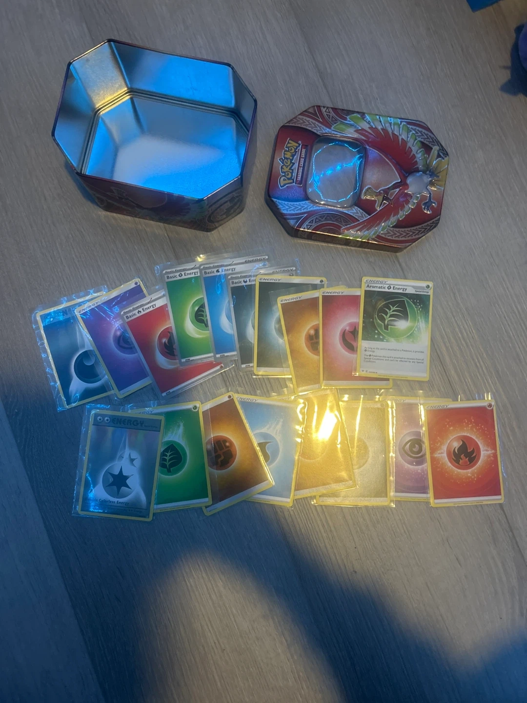 Selling a Pokemon Trading Card Game set! Includes various energy cards and a decorative tin for storage. Perfect for any Pokemon card collector or player looking to expand their collection. Mint condition.