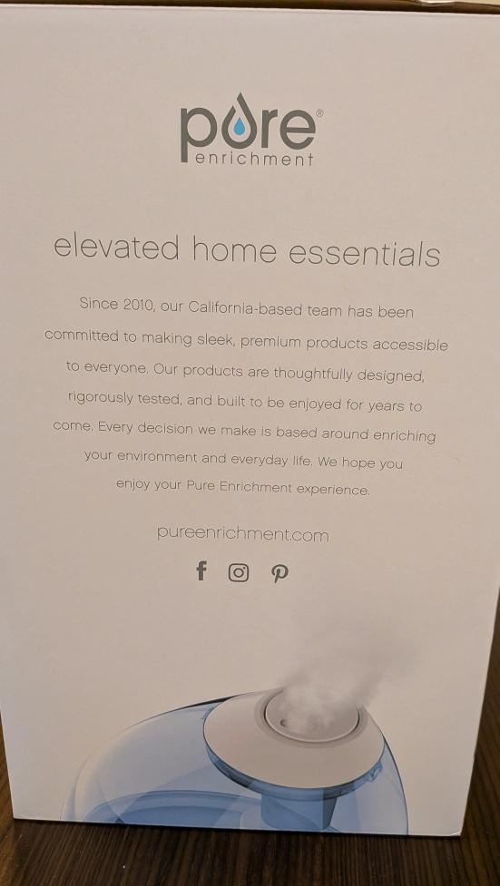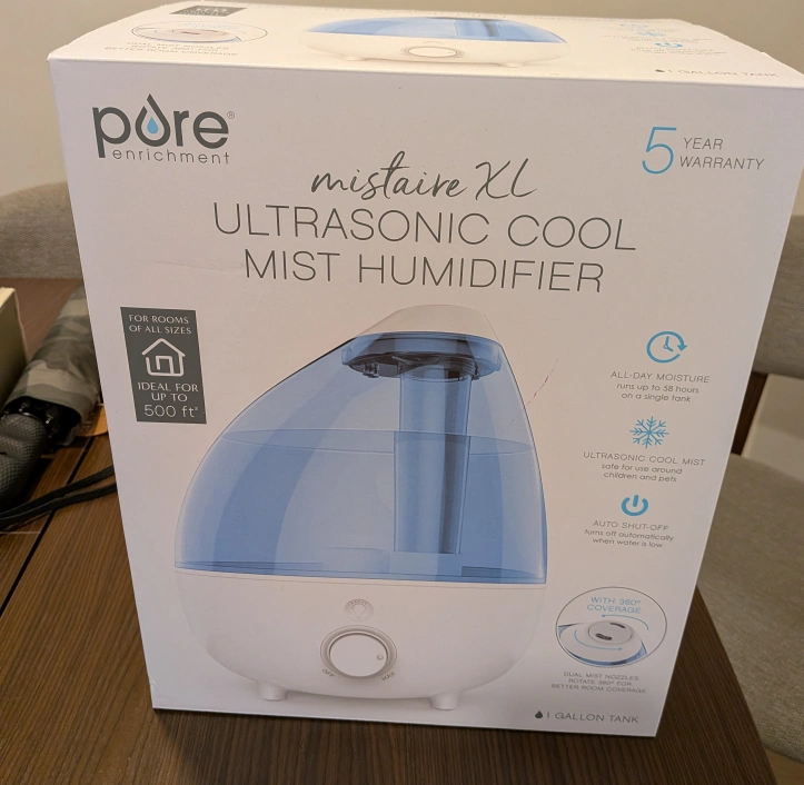 I'm selling a Pure Enrichment MistAire XL Ultrasonic Cool Mist Humidifier. It has a 1-gallon water tank capacity and is ideal for rooms up to 500 sq ft. It features variable mist control, dual mist nozzles, and whisper-quiet operation. Also included are 2 mist nozzles and a cleaning brush!