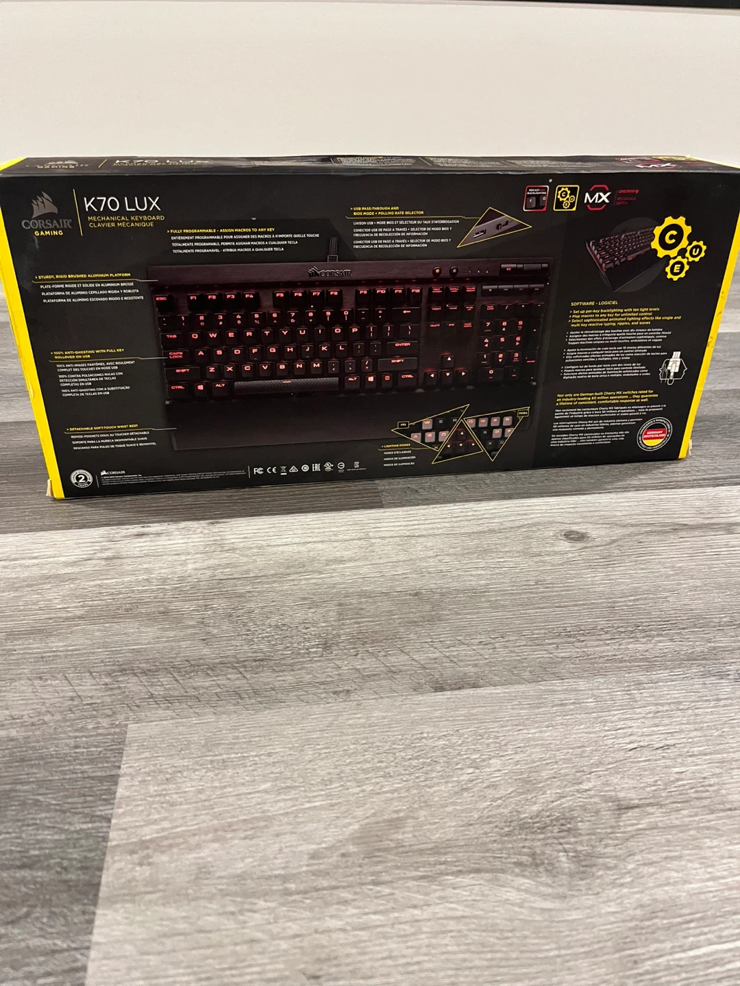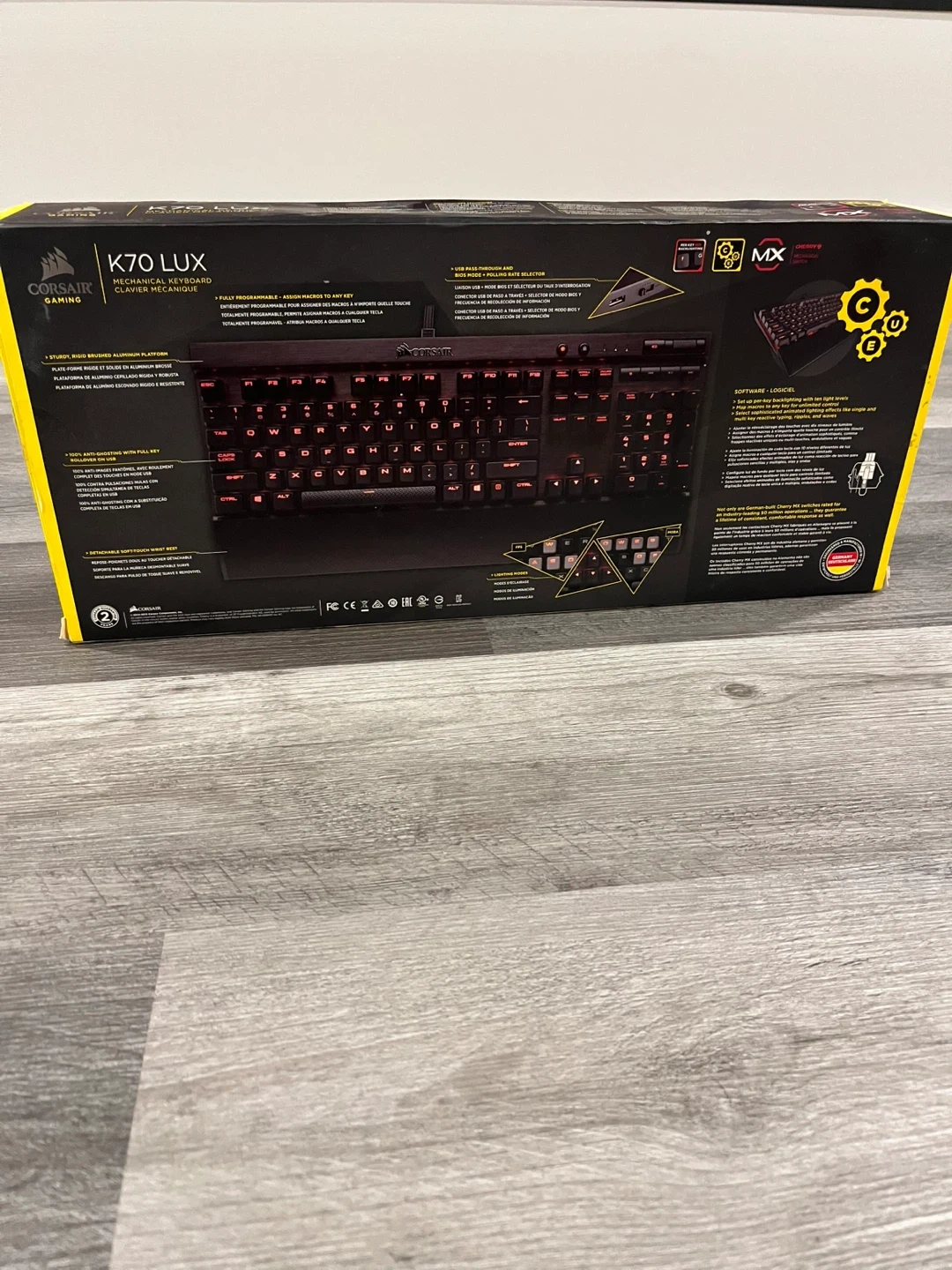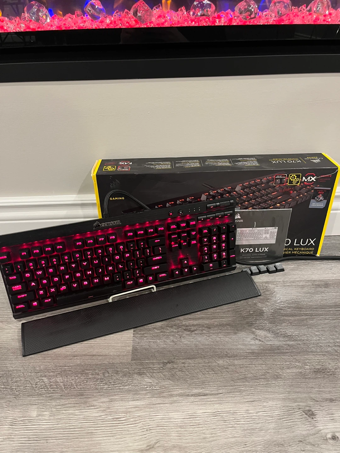 Selling a Corsair K70 LUX mechanical keyboard! It features red LED backlighting and comes with the original box and wrist rest. Also included are some extra keycaps and the manual. Great for gaming or just typing in style!